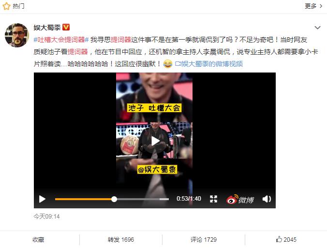 ![]() 最近,易立竞的精彩吐槽,也引得网友连连称赞,不过有细心的网友发现,易立竞吐槽的时候,前面是有提词器的,小编给大家做好了动图,大家仔细看: ![]() 看到前面大牌子上的字了吗?那就是提词器,有提词器就有稿子,有稿子就有写的人,所以你懂得!所以,提词器就在哪里,现场的观众也可以看到,为什么现场的人还那么“震惊”“赞叹”“鼓掌到站起来”.....其实关于提词器的事,当年池子就说过这事,说“我看提词器怎么了,李晨专业的主持人还照着手卡念呢”。所以,既然是娱乐现场嘉宾当然都知道,也就再怎么吐槽也没翻脸的了! ![]() |