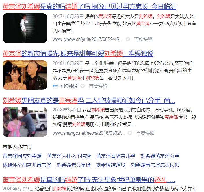 港剧演员绝对是在我们盘点影视剧最佳演员的首选,那里出了不少优质明星演员,近几年他们也来到了大陆发展,很有几个发展是很不错的,像是黄宗泽,人家确实是颜值好演技佳观众缘十分热情,除开演技之外,他现实中的几段感情都还蛮让人关注的,网上之前还有在传黄宗泽刘希媛的关系,所以他俩是情侣吗,他俩怎么认识的? 黄宗泽刘希媛什么关系是情侣吗, 黄宗泽和刘希媛没有什么关系,也并不是情侣,之前网上传的沸沸扬扬的,甚至说还得到了黄宗泽母亲的认可,两人都领证了什么的,可现在看来,黄宗泽和刘希媛两人都没有对这样的传闻进行回应,这样没有下文的绯闻也仅仅是网友们的自嗨猜测罢了。 网上传闻中两人的绯闻是在2015年,只是因为据说在一次因为邀请好友新店试菜,产生了噪音被投诉,警察来过之后,刘希媛站出来帮忙解释说和,招呼客人之类的举动,就被说成了黄宗泽的新女友了。 媒体紧跟其上常常报道,一段时间在媒体的书写中,两人都领证结婚的状态了,然而后面两人又没有了交集,于是媒体解释说是分手了,刘希媛也变成黄宗泽的前女友,这个关系从一开始都是一种猜测,到后面更是猜测的自圆其说罢了。至少两人当事人是一个都没有站出来承认的。 他俩怎么认识的? 刘希媛和黄宗泽是在媒体的报道里认识,其实现实中两人目前根本不咋认识,之前刘希媛因为在三亚违停的事情闹出了很多关注,于是媒体采访了黄宗泽,因为这个时候刘希媛挂着黄宗泽前女友的身份呢,黄宗泽也算是对自己的这个绯闻女友第一次做了澄清,表示自己不认识这个人,一场误会罢了。