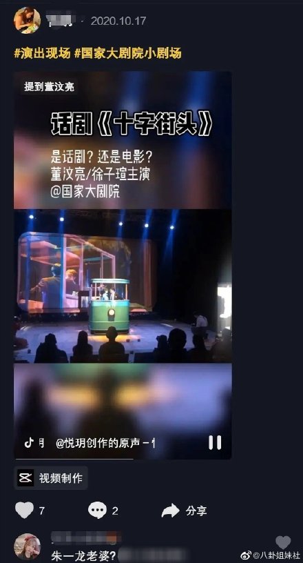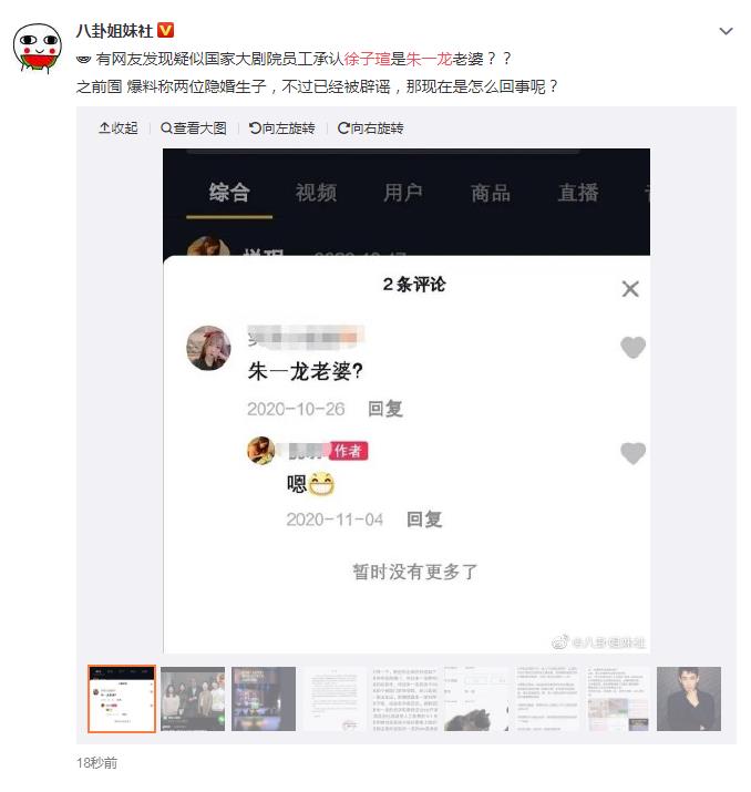 最近各种“孩子”“隐婚”的消息占据了娱乐圈,先是王子文承认自己有一个孩子,还有参加青春3的陈俊宇被曝出未婚先孕等等...今天又有新料,徐子瑄被爆料称是朱一龙的老婆。事情是这样的,最近有话剧工作人员发了一个徐子瑄的话剧表演视频,有人在视频的评论下问到“这不是朱一龙的老婆”,而工作人员回应了一个“嗯”,下面是国家大剧院员工和网友的互动截图: