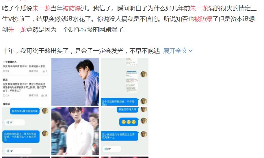 在饭圈混,很容易就会遇到一些糟心事,因为很多艺人的黑粉非常多,尤其是越红的人,黑粉数量就越庞大,不过很多饭圈的人都觉得,这些黑粉并不是真实的路人,而是被对家买来的职业水军,他们的存在,就是为了防爆艺人,防止艺人更上一层楼。 朱一龙在拥护他的粉丝心中,就是一个美强惨的艺人,自他走红以来,就各种黑料不断,因此在很多粉丝心中,这就是对家在强行黑朱一龙,想要防爆朱一龙,粉丝认为,朱一龙的一切负面传闻都是假的,是有人故意污蔑朱一龙,原因是因为朱一龙太火了,挡了不少人的路,才会被这么对待。 防爆在饭圈的意思十分简单明了,就是为了阻止某个艺人走红而采取的强制手段,比如爆黑料、p丑照、撤热搜、请水军等,都是防爆的手段,总之就是对家下场,造成路人缘差、黑料多的局面,而达成自己的意愿,比如说争代言、抢角色的时候,就会有很多水军下场,以此来达到自己的目的。很多粉丝都说,朱一龙是被防爆的最惨的一个艺人。 据说朱一龙在很多年前就被资本防爆过,据说新边城浪子播的时候,收视率还是不错的,不过可惜因为有资本介入,所以这部剧并没有给朱一龙带来多少加成,至于说“防爆到三十五岁”,只是网友们玩的梗,并不是真的,意思就是资本防爆朱一龙,要让他在最好的演员年纪不能走红,但没有想到《镇魂》的意外爆红,直接让朱一龙晋升顶流行列,只能说时也命也。现在朱一龙马上就要35岁了,粉丝们都希望资本不要再防爆朱一龙。