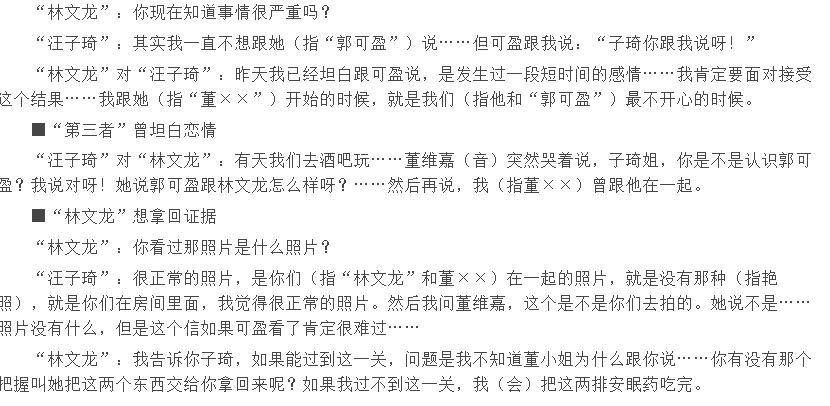 郭可盈和林文龙之间的纷纷扰扰每隔一段时间就要被媒体拿出来说道一下,这对于郭可盈的名气来说,都是不小的打击,所以虽然郭可盈很美,她的影视作品很好看,在港剧中给我们留下了很深的印象,很多经典角色,但是喜欢她的人渐渐变少了,而在郭可盈林文龙录音事件之后,就更是让人唏嘘无语了,所以录音内容是什么,另外也来回顾一下她年轻时的照片组图吧。 郭可盈林文龙录音内容是什么, 郭可盈林文龙录音内容是林文龙的出轨之后和经纪人的对话,录音中林文龙经纪人汪子琦表示,自己已经将林文龙出轨的事情告诉了其老婆郭可盈。于是林文龙打电话过来谴责经纪人汪子琦,然后要求其去第三者那里拿回两人的相关照片还有情书,还嘱咐照片绝对不能给老婆看到。并说明自己已经告别过去,为了自己和第三者的事业,汪子琦要帮忙并且不能曝光此事,说道这里林文龙甚至是自杀相挟。 然后郭可盈林文龙手拉着手,互相表示原谅和幸福的同时就将汪子琦以“敲诈”罪告上了法庭,因为汪子琦确实收到了这件事情相关的佣金6万元,于是最后的结果中汪子琦被判了四年牢狱。然而当然了汪子琦出狱之后的反击就更为严厉了。 她年轻时的照片组图 郭可盈年轻的时候是相当美貌的,那时候的她是港剧中为数不多的大家都很喜欢的女主演,她饰演的《谈判专家》中的简洁,还有《刑事侦缉档案》系列中的高婕等等都是港剧中的经典角色,现在提起来都还有几分神往动容,郭可盈的长相也是非常亲和友好,且有着明艳贤淑的气质。