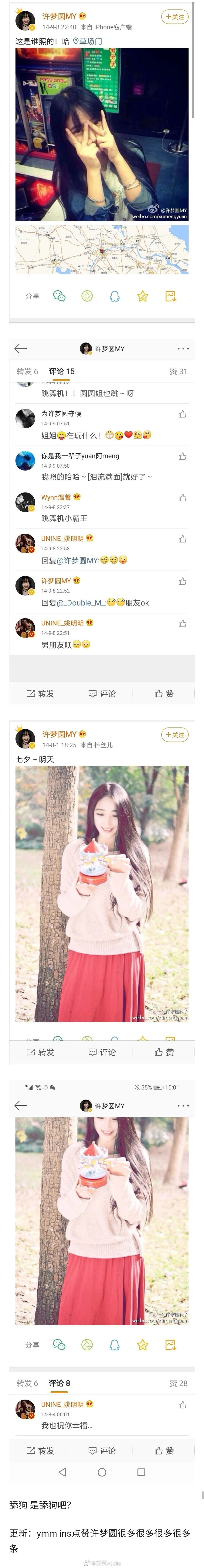 相信昨天不少人都被姚明明的一个视频刷屏了,视频中姚明明跟一个女孩激情热吻,疑似塌房。此后,便有一个女孩发微博称(微博名字MMAQL):“全是因为你 XYL(肖宇梁)!全都是你害的” “如果 当时你没那么绝情 我也不会去找YMM(姚明明)”,对于这个女孩,有人猜测是许梦圆(目前改名许清雅),因为她曾经是蔡徐坤的绯闻女友,跟边程、姚明明、武艺、胡先煦等等私交都不错,不过网友仔细观看视频后发现,视频中女主跟许梦圆身材不像,确定不是一个人。但是可以肯定一点,许梦圆跟姚明明私下关系不错,两个人经常在社交平台上互动: