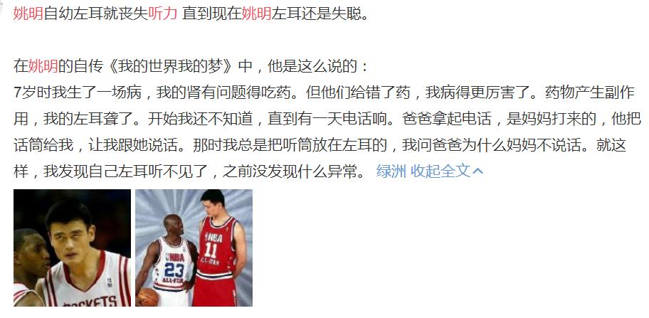 娱乐圈的明星总是让人看不出来年纪,就像是吃了防腐剂一样,三四十岁看起来就像是二十出头,让人们羡慕不已,而体育圈正好相反,几乎每个运动员过了三十岁,都会以肉眼可见的速度变得沧桑,尤其是那股精气神,一下子就感觉不一样了,比如说姚明,感觉他退役后一下子就老了很多。 其实运动员的黄金时期只不过短短十几年,过了三十岁状态会明显下滑,所以三十多岁退役的运动员有很多,能坚持到四十多岁基本上都算是奇迹,姚明作为中国体育界的领军人物,当年他的退役可以说是万众瞩目,不过就算退役了,姚明也没有离开心爱的篮球,而是继续为中国篮球事业添砖加瓦,那么姚明现在在做什么? 职业生涯时期的姚明有很多高光时刻,比如说在NBA征战多年,比如为国家队进了一个又一个篮球,比如说奥运会场上的意气风发。虽然现在姚明已经退役了,但是他依然是中国篮球协会主席,亚洲篮球联合会主席等,是入驻NBA名人堂的首位中国人,那么姚明耳聋是真的吗? 可能很多人都不知道,姚明在很小的时候就左耳失聪了,据姚明自传中所说,他在8、9岁的时候有肾病,所以需要吃药,但没有想到药物就副作用,造成了左耳失聪,从那时候起,姚明的左耳朵就完全听不到声音了,这对于一个运动员来说,打击无疑是致命的,但没有想到姚明却能够凭借自身的努力,让人忘记了他身有残疾,比健康人还要厉害。