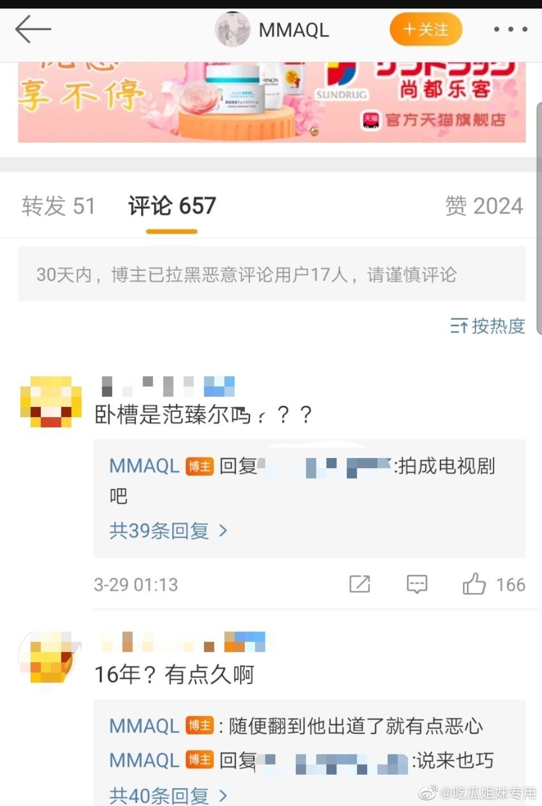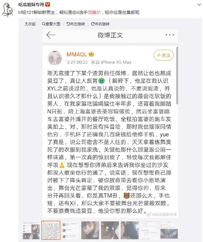 ![]() 除了这个排名的争议之外,范臻尔最近还被MMAQL爆了一个大瓜,MMAQL称自己在认识肖宇梁的时候认识了范臻尔,并称他为软饭男,当时MMAQL放出的两个人在一起的一些图片、音频的时候并没直接点名道姓,但是网友发现MMAQL说的男子是范臻尔。 ![]() 下面是网友和MMAQL的互动,通过MMAQL的微博来看,我们基本可以确定,MMAQL家境非常的好,应该正常在爱豆的圈子里混,也难怪他能认识这么多青春偶像了。 ![]() |