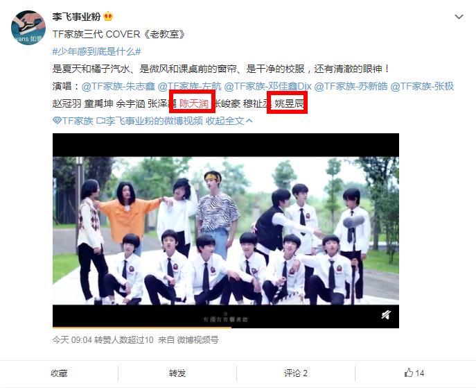 陈天润和姚昱辰都是时代峰峻旗下艺人,TF家族三代团成员,大家都知道,时代峰峻的总部办公室是在长江国际十八楼,所以TF家族成员也叫十八楼男孩,而如果这些男孩离开时代峰峻,就称为:“下楼”,目前来看,陈天润和姚昱辰还是十八楼的成员,并没有下楼。下面是时代峰峻三代团全部成员合照,13个人,分别是:赵冠羽,朱志鑫,左航,童禹坤,邓佳鑫,余宇涵,苏新皓,张极,张泽禹,陈天润,张峻豪,穆祉丞,姚昱辰。