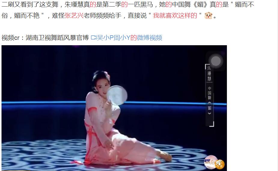去年因为《这就是街舞》第三季,张艺兴收获了很多赞誉,“狂派”这个街舞冷门舞种也让张艺兴成功推广出圈,看过街舞的人都知道,张艺兴一直想做中国风的音乐和舞蹈,所以他对古典舞或者国风舞蹈一直非常关注,后来张艺兴又参加了一档舞蹈类节目,那就是《舞蹈风暴》第二季。 《舞蹈风暴》是一档舞蹈类竞技节目,参加这个节目的都是各个舞种之间的顶尖选手,所以第一季收官后,去年又播出了第二季,而《舞蹈风暴》第二季可以说毫不逊色于第一季,虽然张艺兴做了这档节目的评委席上,但他本人态度非常谦虚,因此在节目中他的镜头少的可怜,大多数的镜头都给了表演的舞者,但张艺兴本人似乎对此并不在乎,可能对他来说,舞蹈本身的魅力要大于节目和镜头。 在《舞蹈风暴》第二季中,有太多让人惊艳的舞者,比如说华宵一、谢欣、陈镇威等,除了他们之外,还有一位黑马非常引人瞩目,她就是朱瑾慧,朱瑾慧出现在《舞蹈风暴》第二季的第四期,一出场就让人直呼惊喜。 在节目中,朱瑾慧表演的舞蹈叫做《媚》,她的舞姿绝美,身段也非常漂亮,让张艺兴大呼“我就喜欢这样的”,并且激动的站起来为朱瑾慧喝彩,其实张艺兴在节目中很少有失态的时候,只能说朱瑾慧的舞蹈真的是让他不能自已,毕竟舞者与舞者之间的惺惺相惜,总是最让人心动的,这大概就是舞蹈的魅力吧。