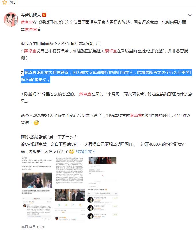 ![]() 蔡卓宜是马来西亚歌手,曾经参加过青春有你,也被爆料过曾经有过一段婚史,甚至坊间一度传言她没有离婚,对于这些传言蔡卓宜表示:“从出道开始就黏着我的标签是:离婚。离婚它是我的经历,但不能是我的定义。”;“我想告诉大家,尤其是那些因为离过婚而自贬的女孩子,一定要做自己爱自己,我们的人生都在自己的手里,走好现在的每一步才是更重要的,想做想尝试的事情就大胆去做,任何时刻、任何经历都不能阻止我们从头再来。” ![]() 下面是网络传言她没有离婚的一些瓜,对此蔡卓宜表示都是谣言! ![]() 据悉,蔡卓宜是2016年12月结的婚,在2019年11月参加青春有你的时候说自己离婚的,有网友猜测因为结婚的人不太容易在这样的节目里走红,所以她才离婚,再加上在《怦然心动》这个节目里,她说自己跟前夫还有联系,这让大家一直觉得她是假离婚。 ![]() 下面则是蔡卓宜前夫和家人的照片 ![]() ![]() ![]() |