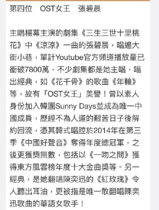 最近在《为歌而赞》节目上,张碧晨谈到了自己的标签ost女王,自己曾经也很苦恼这个标签的,但是现在已经释然并接受了,其实看到这里还有很多网友是有点不明所以的,不知道这个ost女王是什么意思?反正听着好听,但又不太像是夸赞人的词汇呀,更有网上总结出了中国四大ost女王分别都是谁,来给大家点一点。 ost女王是什么意思? ost女王的ost的全称是Original Sound Track的,意思是原声音乐,原声带,就是一首歌曲或者音乐第一次出现在某种媒体中,大致可以理解为影视剧中的配乐,而被称为ost女王意思是这些女歌手唱了很多影视剧中片头片尾曲插曲等等。 而成为ost女王那就比较厉害了,一般这种女歌手常年演唱影视剧插曲,大家是常闻其声,不见其人,对她的声音歌曲特别熟悉,但就是不大熟歌手本人,尤其是在看韩剧的时候,很多韩剧的插曲都非常好听,大家耳熟能详,但要说问道背后的演唱者,就有点蒙圈了,所以能被称为ost女王的歌手,也是比较为人熟知的,要大部分影视背景音乐都有她的演唱,还要大家比较熟悉她的名字和长相呢。 中国四大ost女王分别是谁 中国四大ost女王分别是张碧晨,郁可唯,张靓颖,姚贝娜等等,不过目前最为人熟知且公认的就是张碧晨了,毕竟这几年比较火爆的影视剧,都有张碧晨的演唱插曲,像是《三生三世十里桃花》中的一曲《凉凉》,还有最近的电视剧《长歌行》的片头曲《光的方向》等等。 而前两年最让人喜欢的歌曲《知否知否应是绿肥红瘦》的主题曲,就是郁可唯,胡夏演唱的,这首歌至今都还是很多人手机里经常播放的收藏曲。