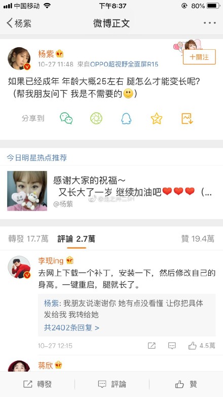 李现成为现男友之后,就是高度的名气上升期了,最近也一直走在热搜的排行榜上,有自己和自己玩石头剪刀布的照片这些小日常晒照,还有一个对李雪琴说我不是吴亦凡,这个就引起了很多人的好奇了,李现为什么说他不是吴亦凡。还有一个李现说杨紫我爱你有十米是什么意思? 李现为什么说他不是吴亦凡, 李现说他不是吴亦凡是在参加一个活动的时候,李雪琴想要跟李现来一张合影,李现认识李雪琴,知道她成名的过程,于是调侃道我是李现,又不是吴亦凡。这是为什么呢,这还要从李雪琴的成名史开始说起。 李雪琴不知道大家还有印象没,她不是哪一位女明星,而是一个网络红人,她红起来是因为追星,追的就是吴亦凡,当初的一句你好,我是李雪琴,今天我来到了XX地,你看这个XX怎么怎么样,例如来到了清华大学门口,就是“吴亦凡,你好,我是李雪琴,我现在来到了清华大学,你看这个校门多白”等等,发的多了,在网上也引起了一些关注,尤其是一口的东北口音,自带喜感。 后面居然得到了吴亦凡的回应,而且是采用李雪琴的句式,“李雪琴你好,我是吴亦凡,别管我在哪儿,你看这灯,多亮”。这互动一出,李雪琴自然是火了,更是被称为追星界的锦鲤,所以到了李现这里,在看到吴亦凡的铁杆粉丝来跟自己合影,于是调侃的说一句我不是吴亦凡,此梗一出,大家了然哄笑,当然合照还是照了。 李现说杨紫我爱你有十米是什么意思? 李现说杨紫我爱你有十米是在接受采访的时候,杨紫正在跟记者互动,李现在那边喊杨紫,我爱你,你有十米!虽然李现和杨紫并没有回应说这句话的意思,不过网友们倒是自动补齐了大致原因。可能是为了夸张的夸赞杨紫高的意思,毕竟之前杨紫就询问过成年人腿怎么变长,而李现很乖巧的给P了一个大长腿,这身高这腿长,应该有十米了。