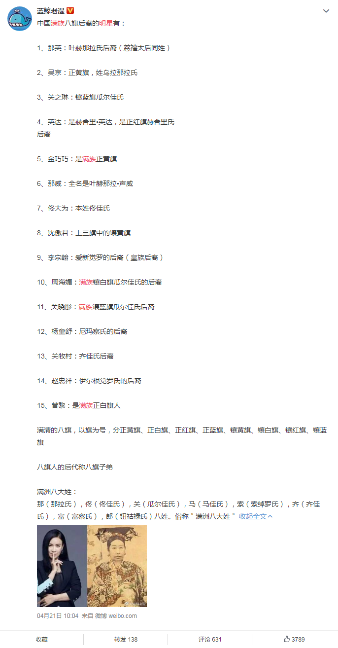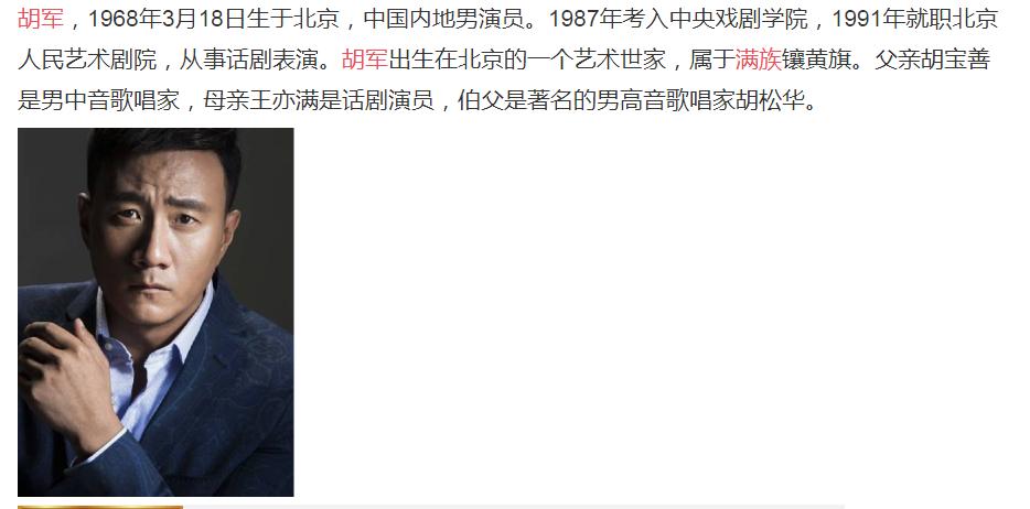 娱乐圈有很多明星都是少数民族的,比如说都佟丽娅、迪丽热巴、古力娜扎等,其实除了这些比较知名的外,还有一些艺人也是少数民族,比如说佟大为、胡军、那英等都是满族人,其实很多人都不知道胡军是满族,因为他的长相是正宗的中原人长相,不过满族本来也是游牧民族,所以这个长相也不奇怪,那么胡军满族的姓氏是什么? 说起胡军,就不得不提《天龙八部》,很多人都是因为这部剧而喜欢上胡军的,其实胡军是属于艺术家类的演员,他很早之前就是国家一级演员,称为老戏骨也不为过,在人们的印象中,胡军出演的作品不算多,但每部都可以称为经典,只能说胡军老师的形象太特别了,娱乐圈真的很缺少胡军这样的演员。 可能很多人都不知道,胡军出身于艺术世家,父亲和伯父都非常有名气,他的父亲是著名男中音歌唱家胡宝善,伯父是著名男高音歌唱家胡松华,所以胡军自小家教很严,可能很少有人知道,胡军家族属于满族镶黄旗,在满族中,镶黄旗属于上三旗之首,所以胡军算是贵族后代。 镶黄旗中的姓氏有很多,比如说像我们熟悉的瓜尔佳氏、钮钴禄氏、博尔济吉特氏、叶赫那拉氏等,都是属于镶黄旗的,胡军的满族姓氏至今是个谜,因此小编并不清楚,其实胡姓在我国也是大姓之一,因此姓胡的人有很多,不知道胡军的汉族姓氏是先辈随便取的还是根据族谱来定的,情况恐怕只有当事人清楚了。