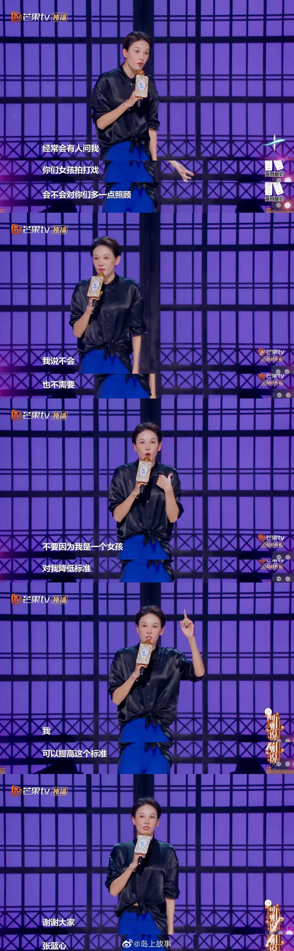 张蓝心,曾经的跆拳道冠军,体育人。退役后转向影视圈,因为其身手不凡,做了武打演员,最近在一次节目上,张蓝心说:“经常有人问我,你们女孩拍打戏,会不会对你们多一点照顾”,对此张蓝心的回答是:“不要因为我是一个女孩,对我降低标准,我可以提高这个标准”,这回答可以说是相当的血性,不愧是当年从苦堆里摸打滚爬出来的跆拳道冠军!