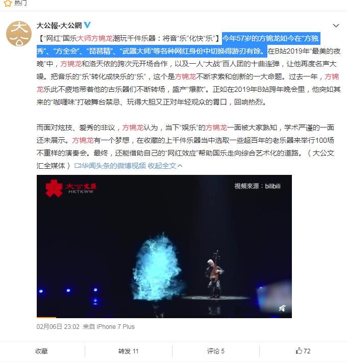 在《冬梦之约》这档节目,张艺兴和方锦龙合作的民乐版《炎黄子孙》大气磅礴,十分振奋人心,这其实不是方锦龙第一次出现在大型音乐会场了,很多人都说方锦龙是国乐大师,现在很多艺人都以能和方锦龙合作为荣,那么方锦龙被叫做武器大师是怎么回事? 很多人都想不到,在年轻人聚集的b站,有很多都是方锦龙的乐迷,在b站的跨年晚会上,方锦龙以一己之力成为当晚最出圈的表演,虽然说方锦龙现在有很多争议,但总得来说,很多年轻人非常喜欢这位满头银发的国乐大师,甚至称他为“人型乐器”。方锦龙能有现在的成绩,和他小时候受到的熏陶有关,方锦龙出生于一个艺术世家,父亲是黄梅戏乐师,他在6岁的时候就开始练琴,后来又学习了很多乐器。 可能很多人都知道,方锦龙有个外号叫做武器大师,原因是因为方锦龙会几百种乐器,甚至一些失传的乐器,他都有所涉猎,在这个浮躁的年代,像方锦龙这样一心钻研民乐的人真的不多了,尤其是这种功成名就的大师,更是让人敬佩不已,那么方锦龙为什么会那么多乐器? 据说方锦龙当年是一位吉他成名的,但是因为他钟爱中国民乐,所以才会学习那么多乐器,如果不是为了推广民乐,方锦龙也不会这么大年纪还玩b站,只是想让年轻人感受到民乐的魅力而已,也因为方锦龙这种热爱民乐的人一直在不断的推广改进,所以民乐才不至于彻底断绝。