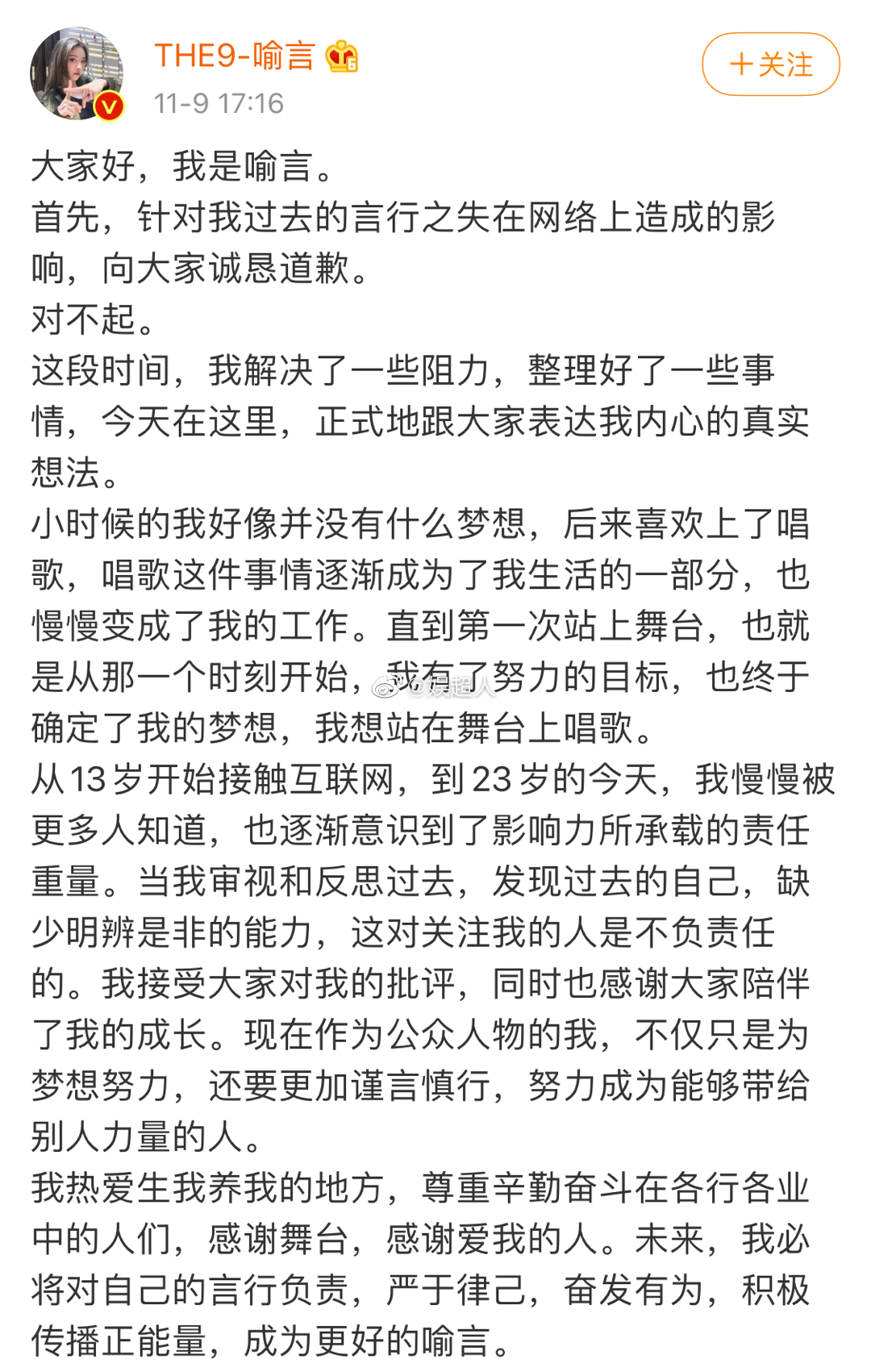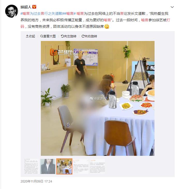 ![]() 满背纹身 ![]() 社交媒体上的一些不雅照片 ![]() 打着舌钉的图片 ![]() 为一些不合格的产品做代言,在这一系列的黑料出来之后,事件迅速发酵,各大综艺节目、合作方纷纷将喻言参加节目的视频画面给打码处理了,这就是喻言被打码事件的前因后果。 ![]() 而THE9的官博也直接发公告称喻言身体有问题,暂停参加了很多节目的彩排 ![]() 对于自己早期的过错,喻言也发微博道歉,称自己13岁接触网络,“过去的自己,缺少明辨是非的能力”。。而粉丝对于喻言当然是一如既往的支持的,因为喻言视频被打码,她被称为“码姐”,而粉丝们对喻言不离不弃的爱,被称为“爱码”,有一个电动车的品牌不是“爱玛电动车”吗,所以喻言的粉丝被称为“电动车”;还有喻言早期上网的ID叫“喻不吝”(参考本文上面喻言代言产品的图片),所以粉丝也叫“喻吝军”(谐音同“御林军”);当然了因为喻言的名字上有个“言”字,粉丝也可以叫做“言丝”。 ![]() |