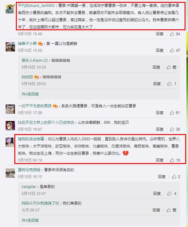 ![]() 因为很多调侃曹县的段子都是跟上海联系在一起的,比如“宁要曹县一张床,不要上海一套房”,再比如:“我出生在上海,而你一出生就在曹县,我拿什么跟你比”,曹县这些让上海都黯然失色的、一本正经的调侃,让很多网真的搞不清到底是上海好,还是曹县好了,其实通过百度百科的资料来看,曹县是菏泽市的一个县,2017年的统计数据来看,有167万人口,2019年实现产值434亿元;而上海人口2400多万,2020年产值38700.58亿元,别说曹县跟上海没法比,就是菏泽跟上海比都差很大一截呢。上海和曹县只是网友拿来对比的一种“反差梗”。 关于曹县的梗,还有很多很多,几乎在每个关于曹县的评论区内都会有大量此类的评论。 ![]() |
