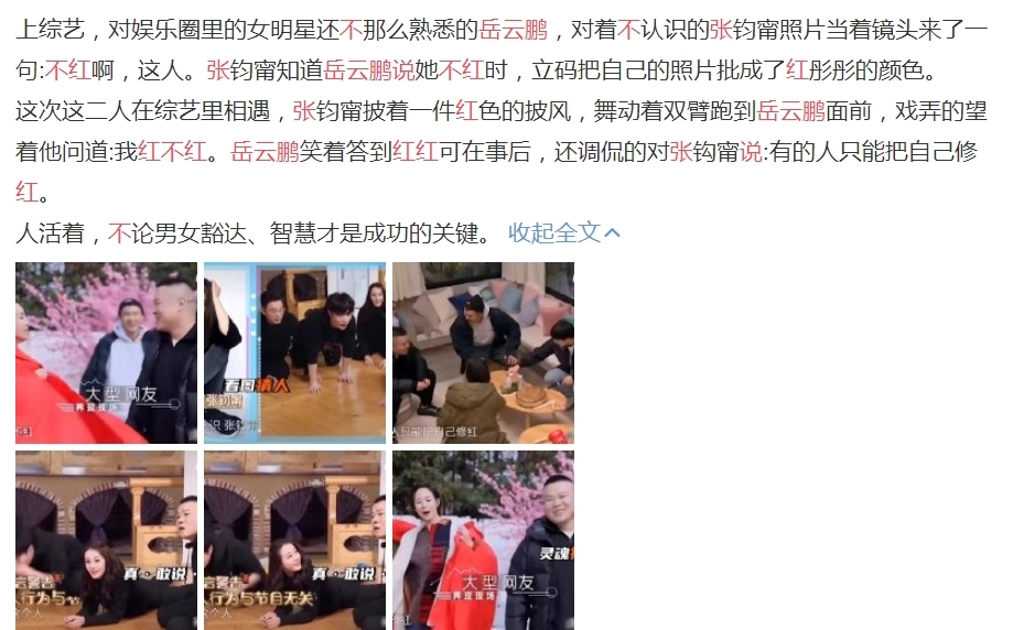 《极限挑战》前四季在网友心中的评价一直很高,到了第五季的时候,因为导演出走,原来的常驻嘉宾男人帮黄渤和孙红雷离开,张艺兴和黄磊也经常缺席,因此很多人都说失去了原来的味道,就算第五季开始加入了雷佳音、岳云鹏等常驻,也让这个节目的评价越来越低。 不过综N代总是很难维持原来的质量,所以加入新鲜血液也算是情理之中,所以在《极限挑战》第六季的时候来了个大换血,罗志祥因为前女友的事情被迫退出,张艺兴因为行程问题也宣布退出,除了王迅外,男人帮都离开了《极限挑战》,而挑大梁的变成了岳云鹏和雷佳音、贾乃亮。 岳云鹏参加过很多综艺节目,而且很有综艺天赋,《极限挑战》第六季的很多梗都是岳云鹏贡献的,在《极限挑战》第六季第一期中,在做游戏的时候,岳云鹏等人看照片猜明星的名字,到了张钧甯的时候,岳云鹏说了一句“不红啊,这人”,让其他嘉宾目瞪口呆,也因为这句话,把岳云鹏送上了热搜。 后来岳云鹏在微博上和张钧甯道歉,张钧甯还回复了,这件事结束后,两人还在另一个节目见面了,而且相处的还不错,其实张钧甯的名气还是可以的,虽然算不上一线女星,但是很多人都看过她演的剧,比如说《少年四大名捕》、《温暖的弦》、《最美的时光》等,而且张钧甯是中国台湾人,所以她在内地的时间很少,尤其是她的名字很难念,因此能读出她名字的人很少。