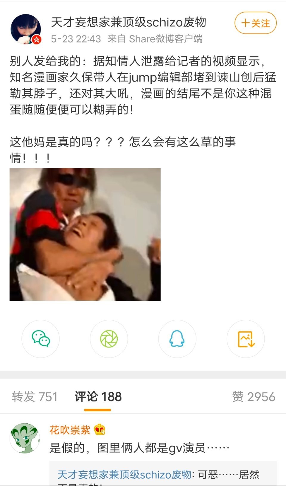 昨天,有网友发微博称,因为久保带人不满《巨人》结局,然后在jump编辑部堵到谏山创后猛勒住其脖子,对其大吼:“漫画的结尾不是你这种混蛋宿便可以糊弄的”。