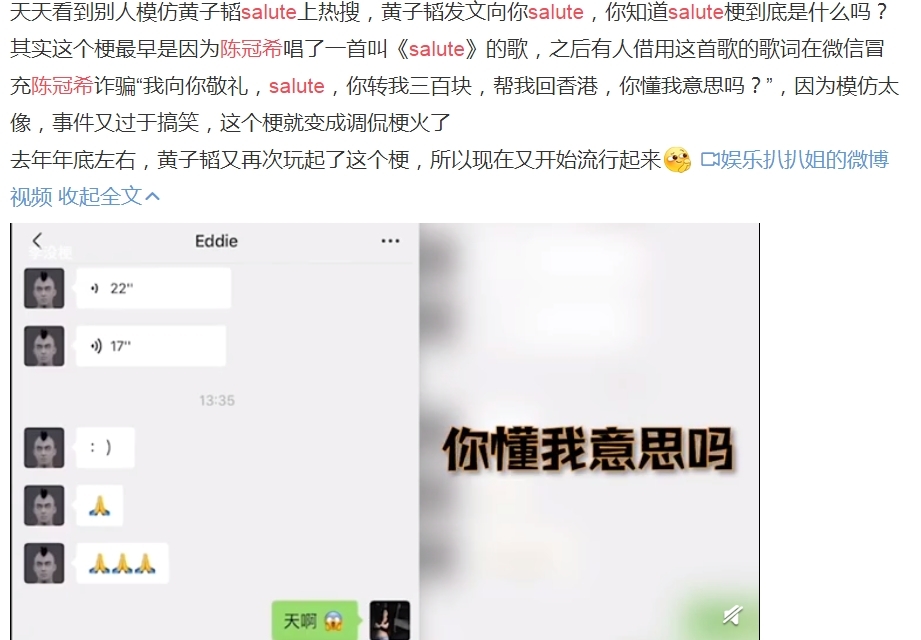 这段时间感觉黄子韬变化挺大的,尤其是在他父亲去世后,感觉黄子韬越来越放飞自我了,不知道是不是因为压力太大的原因,他不但要管理公司,还有很多个人行程,真的可以说是分身乏术,很多人都说黄子韬“真实”,但这种“真实”又何尝不是黄子韬的保护色呢,那么黄子韬salute是什么梗? 黄子韬曾经是EXO的成员,不过在2015年,黄子韬宣布和sm解约,当年黄子韬解约事件做的不太地道,所以被嘲了很久,不过网友都是健忘的,后来黄子韬因为出众的综艺感而收获了不少热度,再加上他的“耿直人设”也是十分吸粉的,因此黄子韬虽然一直是“归国四子”中排名最末,但凭借着各种梗和炒作,在娱乐圈占据了一席之地。 其实黄子韬salute的梗来自于陈冠希,陈冠希当年有首歌叫做《salute》,后来有人在网上冒充陈冠希借钱,用的就是这首歌中的歌词:“我向你敬礼,salute,你转我三百块”。后来在网上火速传开,这个梗就火了。去年黄子韬在网上直播时又用了salute这个梗,现在又重新火了起来。 去年黄子韬在直播的时候劝粉丝分手,用上了salute的梗,其实salute就有敬礼、致敬的意思,因为黄子韬经常用到这个梗,所以很多不知道的人都以为这个梗是黄子韬,所以被黄子韬粉丝广泛运用,现在逐渐成为黄子韬的代名词,甚至一些媒体也在玩这个梗,不过我们都知道这种梗都是一时的,黄子韬想要在娱乐圈站稳脚跟,最好还是拿出作品来,才能让人信服。