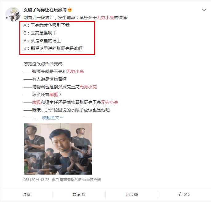 ![]() 无穷小亮有一个外号叫藏狐,主要是因为他的脸型和眼神像极了藏狐这种动物,来一张对比图大家看下 ![]() 另外,他还有个外号叫玉亮,主要是在一次演讲直播的时候,他安利大家去听,然后有人问是不是他本人,去听听就能听到我的“玉音”了,还能看到“玉手”,再加上他的名字叫张辰亮,所以大家都叫他玉亮了。 ![]() 玉亮是靠什么起家的??当然是靠才华!才华吸引了大部分粉丝! ![]() |