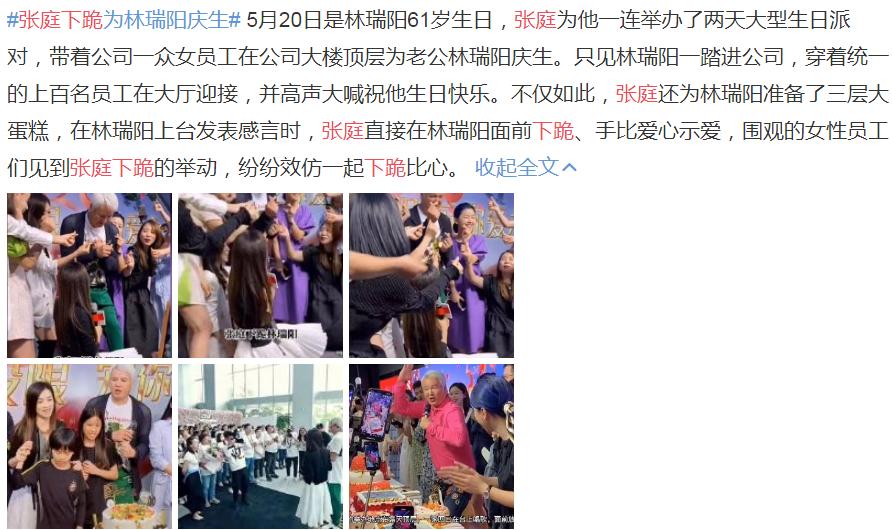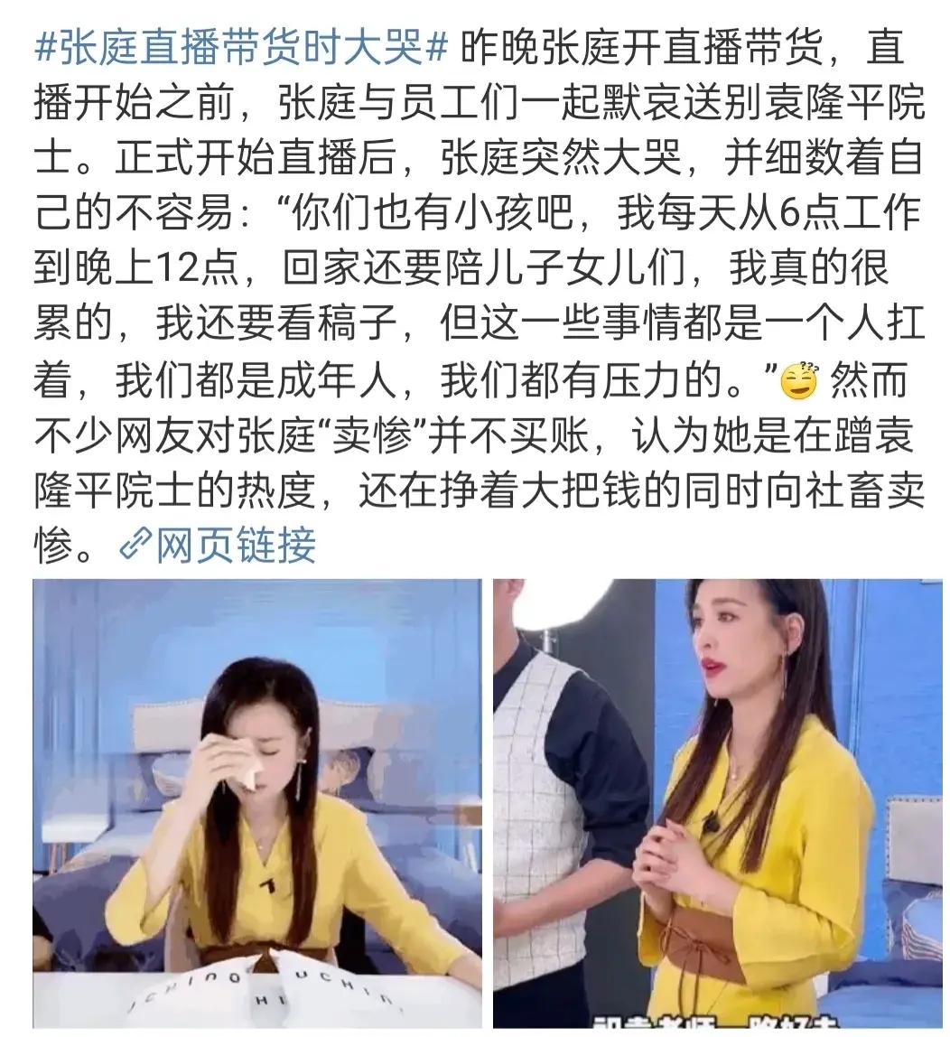 说起来张庭曾经也是很多人的童年女神,她主演的电视剧有《绝色双娇》、《穿越时空的爱恋》、《花姑子》等,被称为酒窝女神,不过自从和林瑞阳在一起后,张庭的名声也受到了很大的影响,因为张庭和林瑞阳在一起的时候,林瑞阳还没有离婚,所以张庭和林瑞阳在台湾待不下去了才会来内地发展。 现在的张庭是个很成功的商人,经常会和老公林瑞阳秀恩爱,虽然说两人也经常被爆出负面新闻,但因为本身已经不算艺人了,所以对他们的影响并不是很大,而前段时间林瑞阳生日,张庭就为老公林瑞阳举办了盛大的生日宴会。 在林瑞阳的生日宴会上,张庭向老公林瑞阳表白,还单膝下跪林瑞阳比心,来表达自己的爱意,身边的女员工也纷纷效仿,照片流出后,网上一片热议,很多人都觉得张庭太过了,虽然后来林瑞阳也出来为张庭说话,但网友并不买账。其实这不是张庭第一次出现负面新闻了,近日还因为卖惨上了热搜,那么这是怎么回事? 袁隆平的去世让很多人都悲痛不已,所以当天很多人都自发的取消了娱乐活动,但是张庭当年的直播并没有取消,甚至还买了一些婚礼用品,让很多网友提出异议,但是张庭却一边卖衣服一边哭泣,说自己有多么多么不容易,多么多么辛苦,在直播的时候一直在哭,但是网友们并不买账,觉得她是在卖惨,所以网上都说张庭被下降头了,这次翻车对张庭的影响也是蛮大的。