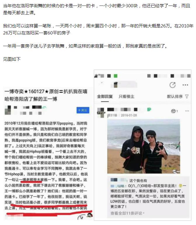 ![]() 另外,关于王一博,粉丝们还有一个津津乐道的话题,那就是他的家境,目前关于王一博的家境有2个说法,第一是家境不好,初一的时候因为家境贫寒辍学了,还因此被黑粉们调侃为“九漏鱼”(九年义务教育漏网之鱼),另外一个说法是他的家境非常的殷实,在跟赵丽颖拍摄《有翡》的时候,有一个花絮就是王一博跟赵丽颖谈自己小时候报各种兴趣班的事,他说自己报过很多兴趣班,但是基本都不了了之,喜欢这个就学这个,喜欢那个就马上换,这种报兴趣班的节奏肯定不是“家境贫寒”的人。 ![]() 15路小编综合了网友的资料来看,王一博是家庭的独生子,一家三口人,从小据说是姥姥带大的,13岁初中辍学是因为舞蹈天赋很棒要去韩国学街舞,然后他的父母有个说法是做老师的,妈妈长的很漂亮。知乎网友@南风过境说,王一博当年在洛阳上的街舞学校是一对一的一个小时300元,一年的开销20多万,这样的开支绝对是中等偏上的家庭水平了,但是他不是富二代是真的,只能说家境殷实。 ![]() 当然,对于王一博,更多的粉丝是建议大家不要关注他的家庭了,更多的关注他的发展和未来的表现,多支持就好了,不管他以前的家庭如何,以现在王一博的影响力,现在的水平肯定是人中龙凤了!下面是王一博的妈妈: ![]() |
