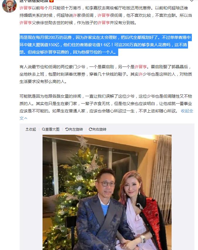 许晋亨有几任妻子, 许晋亨有两任妻子,这对于一个超级富三代来说,还是比较少的了,但是看看他的两任妻子,就会觉得许晋亨人间值得,而且许晋亨之前还有很多红颜知己,交往过诸多美女女友呢,所以两任妻子,那是很满足的了。 第一任妻子何超琼,是商业联姻,何超琼是澳门赌王何鸿燊女儿,对应香港船王的孙子许晋亨,家世相当,门当户对,简直良缘天定,但是这一对少爷小姐并不相爱,两人在婚姻中都是完后任务般的态度,于是婚姻九年还是离婚收场,其实有报道说他们虽然结婚九年,但其实分居都有七年,一直都没有发生公主王子般的爱情。 ![]() 第二任妻子就是李嘉欣了,全香港公认的最美的港姐,李嘉欣曾经在香港豪门界掀起了很大的婚姻危机,直到嫁给许晋亨,豪门太太才算是安心了,而其实结婚之后的李嘉欣也是安心顾家,照顾孩子,生活的也还是很幸福美满的。 他现在有多少资产? 许晋亨现在有百亿资产,但是这些钱他是按月领取的,每月领取200万生活费。许晋亨的父亲当年给他留下了420亿的财产,不过全放到家族信托基金里面了,许晋亨没有一次性的支配权力 ![]() |
