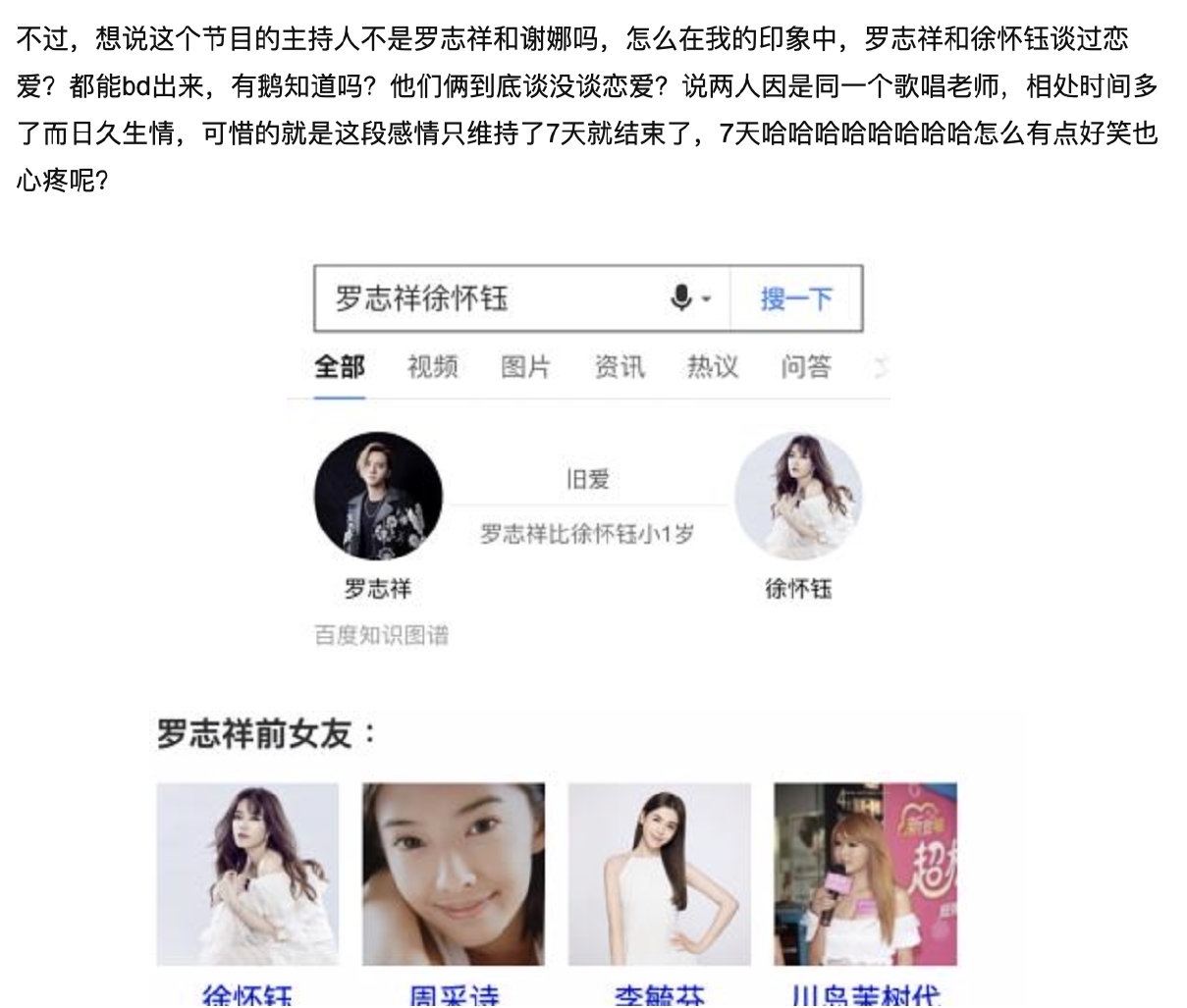 最近因为吴亦凡被网红锤是渣男的报道,让很多人都想起了“时间管理大师”罗志祥,罗志祥因为前女友周扬青的爆料,一夜之间事业崩塌,直到现在也没有缓过来,反观吴亦凡,却一点影响都没有,这大概就是有正牌女友和没有正牌女友的区别吧,只能说罗志祥的前女友周扬青挺厉害,不是小网红可以比的。 如果对罗志祥稍微了解的话,都会知道罗志祥一直是个花花公子,早些年就是花边新闻不断,不过当时信息不发达,不关注的话就很难知道,后来罗志祥来内地发展,因为有了女友周扬青,而且在一起好多年,所以很多人都以为他是个“好男人”。 说起罗志祥的前女友,可能很多人都会想到李毓芬、周采诗等,其实罗志祥和徐怀钰也传出过绯闻,当年徐怀钰的名气也是很大的,两人是同一个歌唱老师,据说两人在一起一共七天就分手了,而分手的原因则是因为各自的事业,不过罗志祥在节目中说过,他和徐怀钰并没有在一起过,只是在一起上课,才传出了绯闻。 在2019年,罗志祥和谢娜一起主持了综艺节目《嗨唱转起来》,在某一期中,节目组请来了罗志祥的前绯闻女友徐怀钰,两人时隔多年再次同台,实在是让人惊讶不已。在节目中,徐怀钰演唱了自己的成名曲 《我是女生》,让人忍不住感叹时间的流逝,据说这次同台的还有罗志祥的妈妈,节目组真的是很会搞事啊,感兴趣的小伙伴可以去看一下。