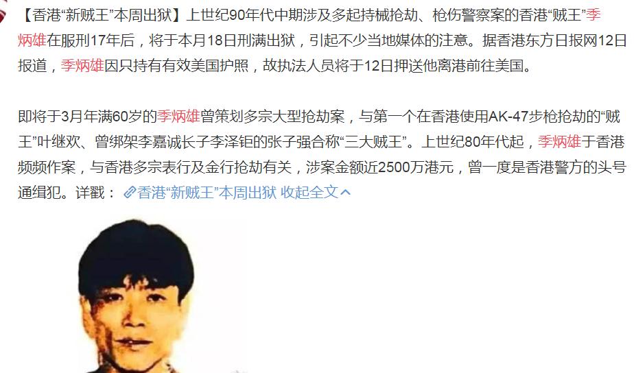 都知道香港的黑帮电影红极一时,其实都是来源于现实生活,因为上世纪八、九十年代的香港,正是绑匪横行、黑社会遍地的时期,因此很多黑帮电影都是有原型的,在上世纪八、九十年代,香港出现了“三大贼王”,都犯下了无数罪行,比如说绑架李嘉诚之子的张子强,还有在香港持枪抢劫的叶继欢,还有前段时间出狱的季炳雄,都是名噪一时。 相比已经死了的张子强和叶继欢,季炳雄现在也算是赢家,毕竟他还好好的活着,季炳雄出生于1960年,是广东人,后来偷渡到香港,曾经有过入狱经历,因为头脑灵活,所以季炳雄作案手法十分狡猾,让警察恨之入骨,不过后来季炳雄还是被捕入狱,被判刑24年。 季炳雄在2020年出狱,因为是偷渡到香港,所以季炳雄的身份是不合法的,他只有美国护照,所以季炳雄出狱后,就被遣送到美国,不过进入美国境内后,季炳雄就被当地警方接走了,至于现在怎么样,就不得而知了。不过很多人都觉得,季炳雄在美国的日子应该也不会太好过。 因为季炳雄的经历太过传奇,犯下的案子也是罄竹难书,所以香港出现了很多以季炳雄为原型的小说或者影视剧,比如说早前的《树大招风》,讲述的是季炳雄在内的三大贼王的故事,还有电影《大事件》,是由季炳雄的原型改编的,这部电影堪称是大制作,感兴趣的小伙伴可以去看一下。