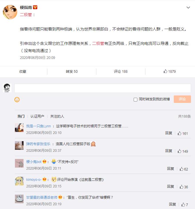 二极管本身是一种电子元件,它有自己非常独特的属性,比如有正负两级,只有正向电流才可以通过等等,根据这个属性,网络上延伸出来了一个“二极管”的梗,主要是用来形容一个人“看待问题非黑即白,不会客观的看待”,比如一个人明星做错了一件事,就全盘否定这个明星的人品,而不管TA之前到底是一个怎样的人,也不具体事件具体分析。