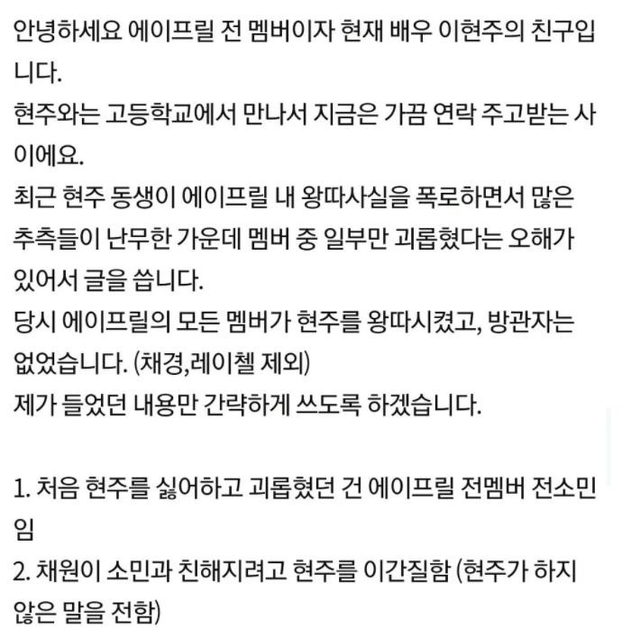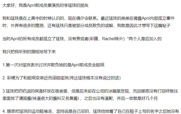 最近关心韩国明星的网友见证了一件韩国娱乐圈现象,那就是一直存在在大家传闻中的排挤孤立事件,都有韩国警方调查李玹珠被霸凌事件了,这应该就是真实有实锤的霸凌了吧,一直都是大家说得多实见少的事情,那必然是要引起广大网友的关注和跟踪的,不知道受到事件影响的李玹珠现状如何,还有她为什么被排挤? 李玹珠现状如何, 李玹珠现状应该是不好受的,毕竟是受到了排挤霸凌,都引起了警方调查了,可见事情已经发生有一段时间而且是很多人见着,还能引发社会新闻的事件,作为当事人的李玹珠,种种郁结可想而知。 在弟弟的出面发贴还有朋友的《April全体成员都是加害者》中,李玹珠是很可怜的,虽然是已经退出了组合,但是April组合带给她的伤害才刚刚揭晓,甚至因此要面对长时间的治疗和自我心理调解,因为据说她因为其他队员的孤立排挤已经换上了恐慌障碍和呼吸困难等等心理问题,所以不管是现在还是未来,应该有好长一段时间的缓和。 她为什么被排挤? 李玹珠为什么被排挤,这是她在遭受排挤的同时被网友们询问的事情,似乎都想将受到排挤这件事归总一个原因,这符合人们的自省性格,更符合人性的逃避问题和站在道德制高点去上帝发声的事不关己态度。而事实上孤立和排挤往往是没有原因的。 尤其是女生之间的小揪揪,有时候就是看一人不顺眼之类的原因,韩国娱乐圈的高竞争也是我们有目共睹的,而排挤的手段除了孤立还有往李玹珠保温杯里放臭酱料,偷李玹珠的鞋子等等,可以说是很韩国偶像剧了。但是作为被排挤的李玹珠,并没有她的王子出现拯救,独自承受的她也终于是崩溃退出了。