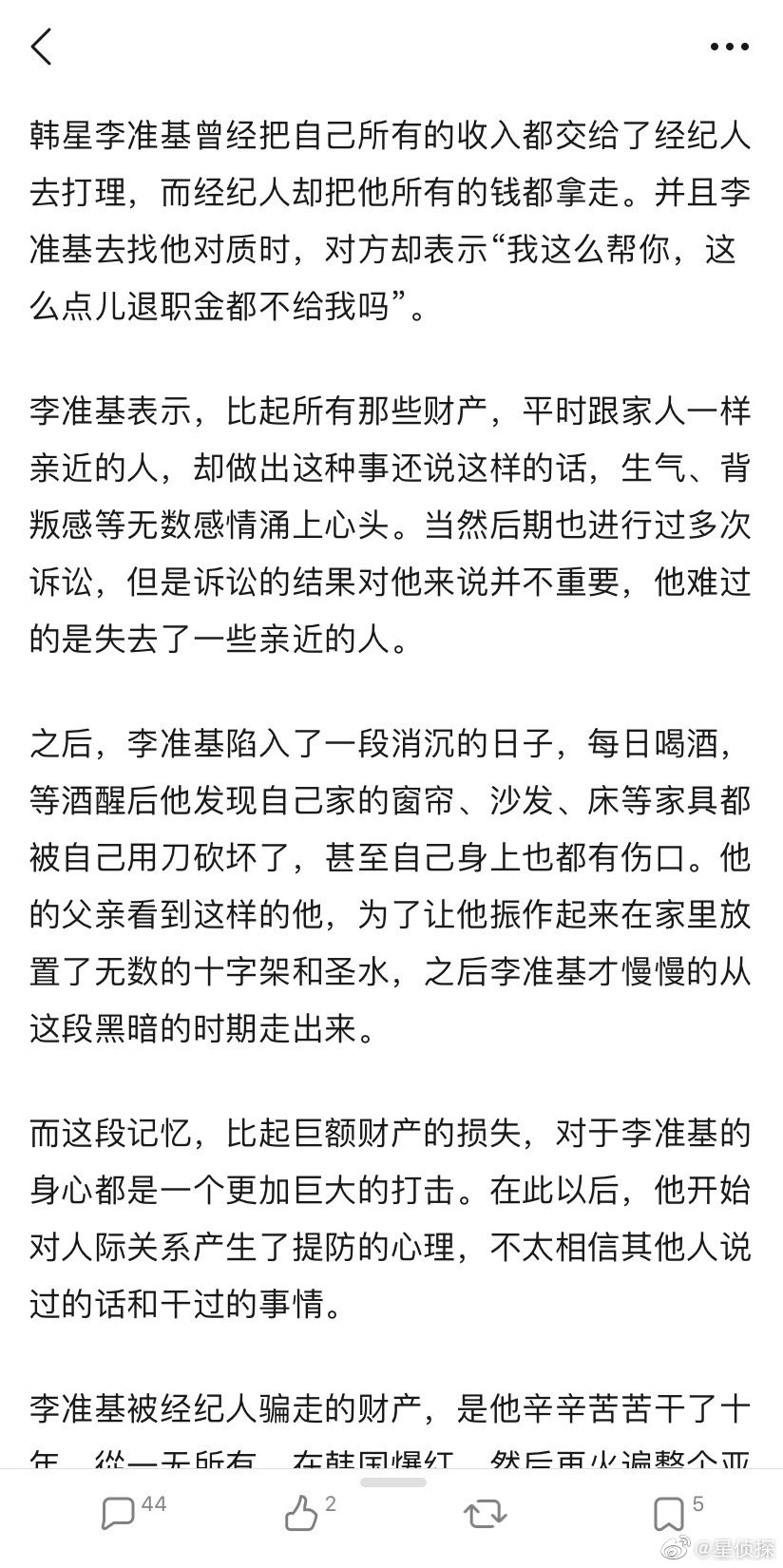 ![]() 很多人认识李准基是从韩剧《我的女孩》开始的,在这部剧中,李准基饰演的男二真的是让人心动不已,后来李准基凭借《王的男人》红透半边天,不管是国内还是国外,都拥有不少粉丝。记得当初李准基获得大赏的时候,还发言感谢经纪人,但是没想到后来,却闹得那么难堪。 ![]() 其实这件事是李准基自己13年的时候上节目的时候说的,他说自己入行十年的积蓄都交给了经纪人打理,因为自己不会理财,再加上经纪人是自己比较信赖的人,像家人一样,所以把自己入行后所挣的钱都交给了经纪人,但是没想到经纪人却拿着他的钱挥霍,李准基向经纪人提出质疑的时候,经纪人却说这些钱是自己应得的。 ![]() 当时这件事对李准基的影响非常大,因为他马上面临入伍,再加上被自己信任的欺骗,李准基当时的心态很差,经常会借酒消愁,甚至还出现了自残行为,好长时间才走了出来。后来李准基和经纪人打官司并且获得了胜诉,不过李准确被骗的具体数额没有对外公布,只知道是李准基入行十年的积蓄,也是他13年以前所有的积蓄了。 ![]() |