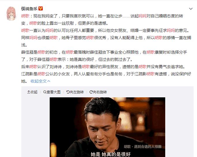胡歌是非常优质的一位男星,他的婚姻大事一直广受关注,之前他跟薛佳凝、江疏影有过一段绯闻,不过都最终不了了之。坊间传闻他的妈妈觉得自己的儿子非常优秀,认为很多女孩都配不上他,给他搅黄了恋情,导致他现在一直单身。胡歌后来说,现在妈妈已经变了,只要儿子喜欢的,她都会选择让步....不少人替薛佳凝和胡歌感到遗憾,当年薛佳凝为了照顾胡歌,没有工作了很久,而胡歌的妈妈还反对两个人在一起,太可惜了!