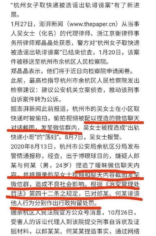 现实中也有“捡手机文学”事件,利用手机文学的方式恶意造谣,不同于同文创作,而是故意抹黑对方,比如去年,发生在杭州的那起事件,快递小哥偷拍吴女士拿快递的视频,并配上捏造的暧昧微信聊天对话截图,造谣吴女士出轨,并发到微信群,给吴女士造成恶劣影响,最后恶意散播谣言的人,也付出了代价。