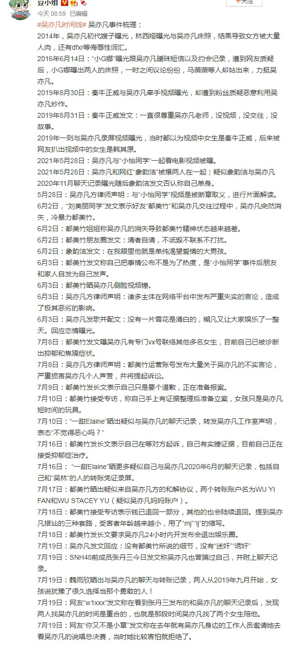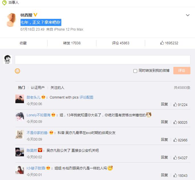 2021年的7月19日,跟吴亦凡有关系的一些绯闻女孩纷纷出来晒了自己跟吴亦凡的聊天记录,比如我们不太熟悉的魏雨欣、张丹三等等。其中还有一个女孩的发文让人尤其唏嘘不已,这个女孩就是林西娅,她发了一条耐人寻味的微博内容是:“七年,正义?拿来吧你 ”,这条微博的意思很明显,等了七年了,正义终于“拿来了”等到了!