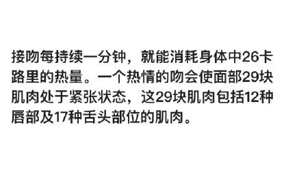 现如今是胖子没前途,瘦子受人爱的时代,减肥成了全民挂在嘴边的必要事件,没错挂在嘴边,因为这世界上阻止大家减肥的东西太多了,减肥太苦太累了,于是不知道什么时候起,网上流传了另一个减肥良方,单纯简单而且不痛苦,那就是接吻变瘦减肥,于是大家纷纷发问这是真的吗?接吻减肥消耗卡路里靠谱不。 接吻会变瘦是真的吗? 接吻会变瘦不是真的,要是接吻就能起到变瘦减肥的效果,大家为啥还要苦哈哈的去管住嘴迈开腿的减肥呢,大家都找自己的对象接吻就好了,变瘦还是要科学系统的去研究去进行,单纯的依赖接吻那是不可能的。 那一段时间网上的科普挂满了页面,什么接吻能变瘦,只要掌握了正确的接吻方法,全身心的投入进去,就能燃烧脂肪,愉悦心情,促进新陈代谢,锻炼脸部肌肉,甚至交换肠道菌群等等的,最终达到瘦脸,瘦身的效果。 这话一看就十分夸大,接吻会变瘦也是因为两人处于热恋期经常一起出门走动,心情愉悦,话说的时间比吃东西多,加上运动适当,瘦是的确会瘦,但是跟接吻关系不大。接吻只是单纯的能传递爱情,并没有其他奇效。 接吻减肥消耗卡路里靠谱不 接吻减肥消耗卡路里不靠谱,不说要求有多高,什么接吻一分钟消耗6.4卡路里,正常人也不会接吻这长时间,还要求每天接吻至少三次,接吻时间越长消耗卡路里越多,热恋期还好说,过了这段时间,应该没有人能撑的住接吻这么多次这么长时间了。 而且减肥是一个持久而科学的事情,单靠接吻去实现那是不现实的,接吻只能是其中一点点缀,更大头的应该是合理的饮食和适度的运动。