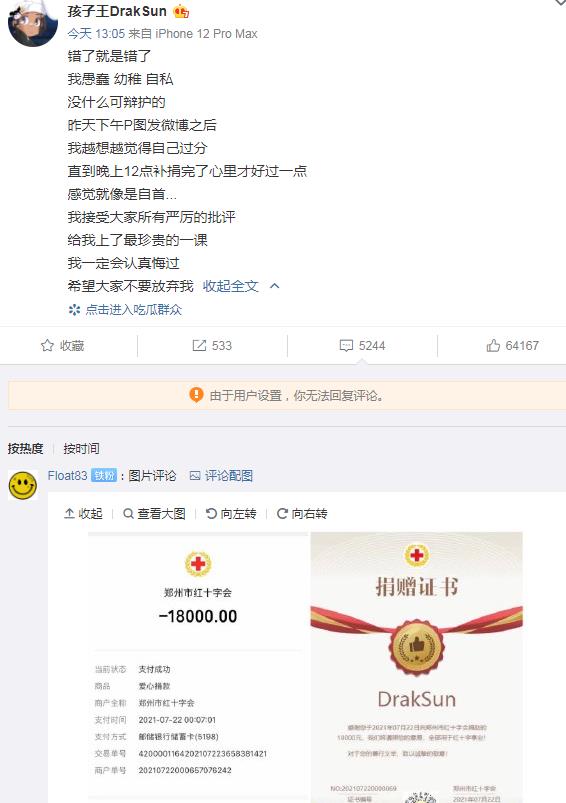 最近的河南水灾牵动了全国人民的心,娱乐圈的明星们也纷纷捐款。知名rapper孩子王draksun也晒出了自己的捐款截图,捐款金额为1.8万元,不过很快有网友通过捐款的编号查出来孩子王draksun只是捐了100块,1.8万是PS出来的。事情败露之后,他迅速补齐的捐款,道了歉。下面是网友查到的他的实际捐款金额:
