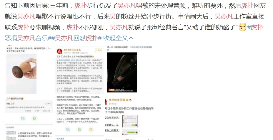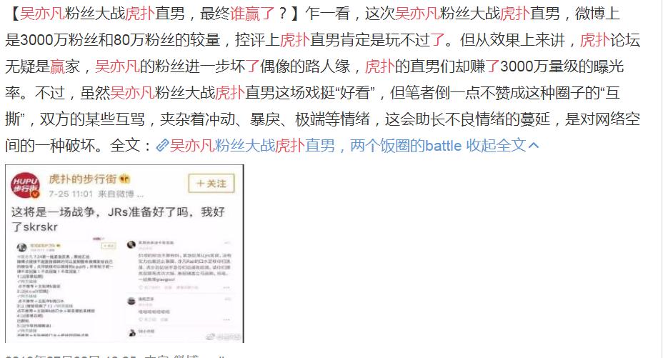 最近吴亦凡真的墙倒众人推,毕竟吴亦凡在圈内这么多年,他和他的粉丝得罪的人实在是太多了,不管是虎扑、b站还是知乎,对吴亦凡的印象都不是很好,尤其是虎扑,这个遍地是直男的社区上,和吴亦凡及其粉丝的恩怨由来已久。 2014年吴亦凡擅自和韩国sm公司解约回国,后来营销成了顶级流量,2016年小G娜事件爆发,对吴亦凡的影响微乎其微,他依然在各个领域玩的风生水起,2018年,吴亦凡加盟《中国有嘻哈》,作为导师的吴亦凡除了流量一无所有,所以很多人都觉得他不配做导师。 虎扑直男一直对所谓的流量鲜肉不感冒,当时网上曝光了一段吴亦凡无修音版的rap,虎扑转发并且说吴亦凡不配做导师,这无疑引起了吴亦凡粉丝的愤怒,所以大批粉丝攻击虎扑,而虎扑直男不敢示弱,奋起反击,这就是当年吴亦凡和虎扑的大战起因,这件事在当年是非常轰动的,尤其是涉及到了rap圈,总之很多rapper都站队了,还有不少支持吴亦凡的。那么这件事的结果是什么? 这件事其实没有赢家,不管是吴亦凡还是虎扑直男,首先说吴亦凡,这件事让其他圈对吴亦凡也产生了恶感,觉得他利用粉丝和舆论,是他的路人缘受到了很大的影响,而虎扑直男恶臭的传言也在网上流传开来,饭圈大多是女性为主,而虎扑以男性为主,所以两者之间的骂战很容易让人对粉丝产生同情,不过因为吴亦凡的公关真的厉害,后来吴亦凡团队把骂战转移到了网络暴力上,这件事才告一段落。