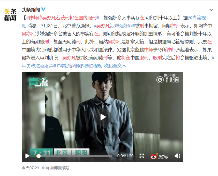 最新消息,北京警方发布消息称:“因涉嫌强奸罪,吴亦凡目前已被朝阳公安分局依法刑事拘留,案件侦办工作正在进一步开展 ”,网友根据之前整理的报道来看,都美竹并没有报案,是吴亦凡的妈妈报警称都美竹敲诈勒索,不过事后证明是某人冒充都美竹的名义联系了吴亦凡的妈妈(此人目前已经被控制),有网友笑称是吴亦凡的妈妈亲手把儿子送进了监狱,当然多行不义必自毙,吴亦凡终将会为自己的行为负责。