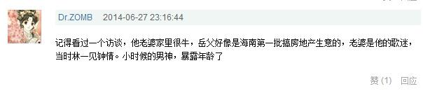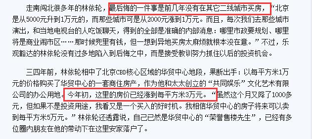 ![]() 林依轮与第二任妻子和儿子 西华曾在节目透露两人一个难忘的情人节,1995年林依轮几乎花光了不到2万块的剩余存款为西华买了一架钢琴,让她下定决心嫁给他。可见当时两人并不是很富裕。 ![]() 也曾有网友爆料两夫妇婚后都买不起车... ![]() 网络爆料 ![]() 西华 就是这个女人成为了林依轮后来致富的关键。 A.林依轮背后的经纪人和老板 林依轮刚到广州那年,西华就夺得了第一届“美在花城”选美亚军,这节目算是内地选美的始祖,是广州电视人引进的“香港小姐”模式,所以从服装皇冠也能看出港姐的即视感。苏谨、张延、姜鸿波、曹众、黄小燕都是通过这个选美成为了“腕级”演员。 ![]() ![]() 西华早期参加选美 比赛结束后西华接拍了王朔小说改编的电影《大喘气》,也是她唯一的银幕作品,更没想到的是,她的表演竟然能让著名编剧史航像粉丝一样追星起来...偷了她的海报贴在自己家,还成了他十几年牵挂的人儿... ![]() 史航自曝是影迷 外界一直说她甘当林依轮背后的女人。但事实并不是这样,05年时西华复出创办了北京共同娱乐公司,担任总经理。林依轮也签到自家公司,事业交由老婆打理。 ![]() 林依轮 西华让他成为了央视《天天饮食》的“掌门人”,这个节目让林依轮有了各家结识名流的资本——我做的一手好菜! ![]() 林依轮转型 之后她又一手将林依轮推到了事业新高度,以电影《爱情故事》男主身份出席韩国国际电影节,出演的话剧获得了白玉兰奖的提名,还在美国百老汇主演过一部音乐剧,因此受邀去纳斯达克敲了次闭式钟。 ![]() 林依轮参演美国百老汇剧目 据小妹所了解,这家公司除了林依轮,还有一个组合:吉祥三宝。 B.林依轮房地产投资方面的的启蒙老师 林依轮曾表示刚有钱的时候几乎没有理财意识,总认为现金最好,舍不得将刚刚挣到的辛苦钱一下都买了房子。等到结婚后,在太太的带动和影响下,林依轮认识到了理财的重要性。这也促成了林依轮07年08年(一种说法是05年左右)以9千一平米的价格买下了北京CBD地段的华贸公寓。 ![]() 林依轮与西华 也有豆瓣网友爆料,他老婆家是做房地产的,所以比较有投资远见。 ![]() 网络爆料 后来林依轮在年代秀上说漏嘴,透露当时在北京买的房子是两栋!!!而不是两套... 09年左右,林依轮因为投资收益已经成为了各家财经杂志的采访对象,也蛮喜欢分享生财之道的: ![]() 采访截图 再来感受一下这个:林!!菲!!特!! ![]() 采访截图 这是2008年末的采访,林依轮北京的房子当时就已经翻涨了三倍!7年后的今天可想而知... ![]() 采访截图 烧一手好菜揽尽富豪的胃 秘制卤大肠壕尽艺术收藏 都说女人会做菜能留住一个男人的心,但当一个男人会做菜,效果真是惊人啊。 这两天传的最火的一个八卦便是:林依轮靠美食打出一圈人脉。曾梵志,任小勇,张朝阳,赵珩这样的人物,美术圈大腕、it风云人物、财富新贵、前朝遗老,这么复杂的各式人等,都肯出席入座,只为了尝尝他亲手制作的卤大肠。曾梵志为了吃一锅莲藕汤能给他连打几个电话。他太太在家闲着说了句想学古琴,北京最好的古琴名家上门去教... 圈外的听了这么多,小妹和你说说圈内的,美食同样是林依轮联络圈内好朋友的妙招: 名模马艳丽曾晒过赴林依轮家宴的照片,女宾都穿的美美的,胜似一场小型晚宴: ![]() ![]() 马艳丽在林依轮家聚会 那英讲起林依轮做的卤肉和炸酱面是这样的,不停吞口水: ![]() 那英讲林依轮做菜吞口水 ![]() 林依轮 孙悦过生日,看到林依轮亲自为自己做长寿面,开心成了这样: ![]() ![]() 林依轮节目中未孙悦煮生日面 去年王中磊参加《爸爸回来了》,说到做菜第一个就想到给林依轮打电话。林依轮立刻奉献陪逛菜市场、教授厨艺、亲自上灶等一条龙服务。