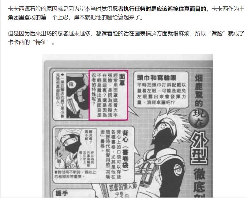 虽然东京奥运会上日本人的做法是很让人激愤的,引起了网上一片的嘲笑谩骂。但是我们也不得不提起日本那让我们着迷很多年的漫画,尤其是《火影忍者》,这部动漫伴随我们走过了青春年少,直到成年之后,由于动漫节凑太慢,很多人都结婚生子很多年也没有看到连载的结局,很多未解之谜也放弃了,尤其是那时候大家最好奇的卡卡西真容,话说他为什么要戴面罩? 卡卡西真容图片, 关于卡卡西的真容动漫也有一期来调动大家的好奇,不说是荧幕外的观众,其实就连鸣人他们也是十分好奇的,因为相识那么久了,大家都没有见过卡卡西的真容,都很好奇呢,而且他们在找了很多方法之后依然没有见到卡卡西摘下面罩的时候,这种好奇就更是被吊的很高,那个时候大家都无比期待和畅想卡卡西面罩之下的面容是什么样子的。 动漫好在是最终也没有敷衍粉丝,还是在有一期的时候让卡卡西摘掉了面罩,摘掉脸上伪装的时候,卡卡西的真容也显露了出来,并没有鸣人他们想象中的怪异五官,那就是一张帅哥脸,还是很温暖的,露出面容的卡卡西多了一点温和,少了很多犀利。 他为什么要戴面罩? 卡卡西戴面罩的原因很简单,因为作者觉得忍者执行任务就应该遮住真面目,引发神秘感,而卡卡西是作为主角团里面登场的第一个上忍,所以就将他的脸戴上了面罩,之后后面忍者多起来了,都把脸戴上面罩的话,就不好画表情了,于是就放弃了,但是卡卡西已经戴上了面罩,那就戴着吧。 后面渐渐的引起了粉丝的好奇,作者本人也将这个想法带给了动漫里面的人物,以卡卡西的真容还展开了好几章节,发动了联想,跟上了漫画情节,还赚了好几章节的稿费,和乐融融呀。