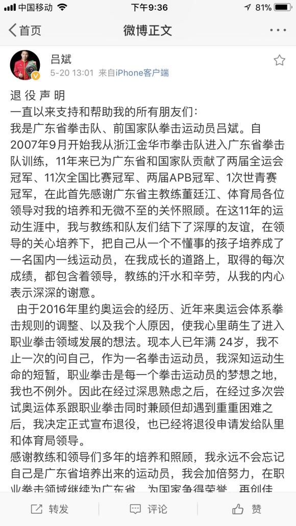 这次东京奥运会的裁判们如何身残志坚已经是全世界共识的了,但是这并不是裁判第一次的此种作为,之前的拳击运动员吕斌,也曾遇到这样的委屈和抑郁,尽管击败了对手,但是却并没有赢得比赛,拿到名次。这件事在当时就引起了很大的轰动,不知道吕斌事件后续是怎么处理的,另外吕斌他现在退役了吗? 吕斌事件怎么处理的, 吕斌事件并没有怎么处理,奥运欠他一个奖牌,至今大家都在谈论这件事,但是这件事已成定局,吕斌没有获得那次比赛的成绩,没有得到那场比赛中他应有的奖牌,他很委屈,当场就泪洒赛场了,就算过去很多年了,吕斌也不会忘记,这成为奥运最大的冤案。 不过好在吕斌的心态是很好的,并不会因为裁判的误判就产出对理想的怀疑和放弃,之后的吕斌更加勇猛,在挫折中积蓄力量,之后的中国拳王争霸赛中,吕斌也打出了很好的成绩,成了中国拳王。 当初裁判的误判有裁判的原因,也有当时的规则原因。而且一经裁判裁定之后,吕斌也是无法上诉了的。所以这件事就成了既定事实,吕斌事件只能在自我中去调整心态,争取下一次的机会。而吕斌也因此获得了全国人民的认可,没有奥运会的奖章,有我们全国人民的奖章。 他现在退役了吗? 吕斌现在已经退役了,之前他有发出一则退役声明,看其中的意思是虽然知道自己年龄还轻,但是深刻了解拳击运动员的生命短暂。也有因为自己的职业调整,于是选择了退出国家队,之后作为一名职业拳击运动员继续自己的梦想。