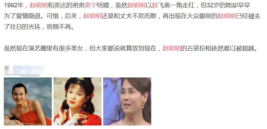演员这个职业更新换代是特别快的,所以很多红极一时的演员,现在都被观众遗忘了,当初和刘晓庆齐名的演员,估计现在很多人都不认得了,而和宋丹丹同时代的演员,也有不少已经退圈了,比如说宋丹丹的弟妹赵明明。 赵明明的第一任老公是英达的堂弟英宁,赵明明和英宁是在大学的时候相恋的,毕业后就直接在一起了,当时两人也是让人羡慕的一对神仙眷侣,但是让人没想到的是,在赵明明怀孕期间,英宁竟然移情别恋了,这对赵明明的打击是非常大的,所以很长一段时间,赵明明都是单身状态。 很多人知道赵明明,是因为《汉宫飞燕》,当时饰演赵飞燕的赵明明被称为古装第一美人,让人们惊艳不已,赵明明的长相可能不符合现在的审美,她有些婴儿肥,也不是“锥子脸”,但不可否认的是,赵明明这样的才是古典美人的长相。和英宁离婚后,赵明明就一直是单身状态,网传赵明明嫁给了一个外国人叫做约翰,但是这个说法并没有得到证实,网上也没有相关资料,所以应该不是真的。 自从2013年拍完《我们一家人》后,赵明明就退圈了,据说是为了照顾女儿,赵明明在最红的时候选择隐退,就是因为怀孕,但没想到在她怀孕期间,丈夫却爱上了别的女人,所以在客串《我们一家人》时,赵明明的状态非常差,看起来老了很多,据说赵明明现在出国了,已经好长时间没有她的消息,希望她能过得好吧。