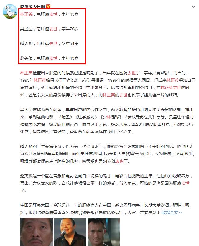![]() 那么林正英真实去世的原因是什么呢??根据可靠的资料来看是因为肝癌,生前林正英喜欢喝酒,可能本身就有肝炎,再加上酒精的作用,让其最终患上肝癌。某些肝炎是具有传染性的,在以前没有疫苗的时候,中国很多人患有肝炎,后来国家大力普及疫苗,现在肝炎患者越来越少了。如果有肝炎的人,再喝酒,肝脏很容易早早的出问题。英叔本身是武行出身,身体很好,平时爱喝点小酒不至于年纪轻轻就发展成肝癌,所以小编猜测可能是跟本身有肝炎有关,当然这只是猜测。 ![]() 除了林正英,患肝癌去世的明星还有赵英俊、吴孟达、傅彪、臧天朔...其中不少人都非常的年轻,极可能是早早的就感染了肝炎,后期生活压力大,饮酒等不良作息,导致加快了肝脏的病变。 ![]() |