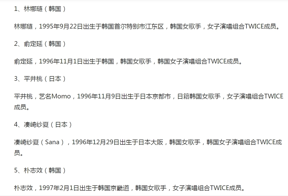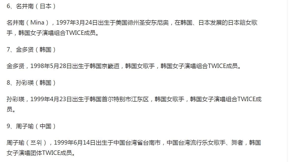 韩娱圈竞争是出了名的激烈,尤其是男团和女团,更是其中的佼佼者,而韩娱四代女团的竞争甚至可以用“惨烈”来形容,尤其是兔瓦斯和粉墨之间的明争暗斗, 让很多人印象深刻,粉墨就是BLACKPINKD的简称,兔瓦斯是twice的别名。无法否认的是,现在韩娱也是一代不如一代了,那么twice在韩国属于几线女团? 虽然说粉墨的名气在中国很高,但是在韩国国内,还是twice的成绩更能打一些,因此twice一直被认为是现役女团中的top,甚至一度登顶,不过twice也不是一帆风顺的,尤其是近些年,据说组合成员的合约快要到期了,所以人们对twice的未来也十分担忧,从2015年出道至今,twice每位成员都有过低谷期,比如说twice的队长朴志效,就因为恋情原因而受到了很多非议。 朴志效是兔瓦斯的队长,在很长一段时间,都被认为是南韩最称职的队长之一,作为队内的老五,97年出生的朴志效真的是“上有老,下有小”,作为队内主唱的她,人气不是最高的,但因为是队长的关系,还是受到了不少关注,不过自从和姜丹尼尔公布恋情后,朴志效的人气和口碑就发生了明显的变化。 兔瓦斯成员年龄排行榜 兔瓦斯一共有九位成员,按年龄顺位分别是林娜琏、俞定延、平井桃(Momo)、凑崎纱夏(Sana)、朴志效、名井南(Mina)、金多贤、孙彩瑛和周子瑜,年龄最大的是林娜琏,1995年出生,年龄最小的是周子瑜1999年出生,因为组合成员年龄跨度很大,所以组合成员对自己的发展路线各有不同,因此很多人都觉得兔瓦斯合约到期后很可能会四分五裂,无法以完整体活动了,希望那一天晚点到来吧。 兔瓦斯成员年龄排行榜