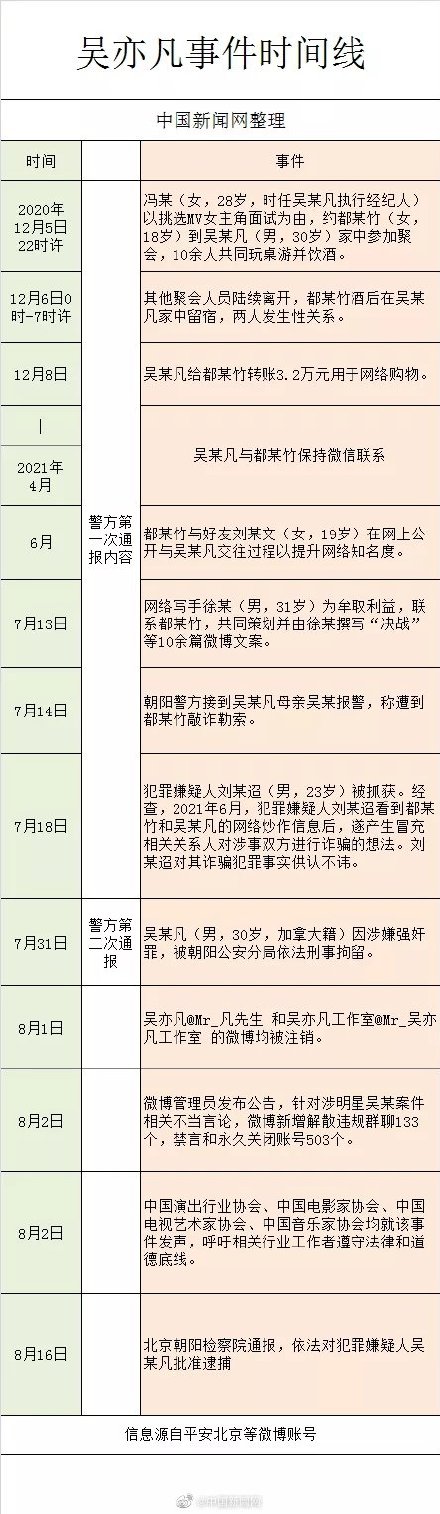 8月16日,北京市朝阳区人民检察院经依法审查,对犯罪嫌疑人吴某凡以涉嫌强奸罪批准逮捕,在得到消息后,都美竹第一时间在粉丝群内感谢朝阳公安,而网友们也纷纷表示吴亦凡“罪有应得”、“大快人心”。至此下步就等法院宣判吴亦凡最终被判多少年了,然后等待吴亦凡的是法律的严惩。吴亦凡最终被抓都美竹功不可没,@中国新闻网整理了吴亦凡和都美竹事件的来龙去脉,一张表看的清清楚楚: