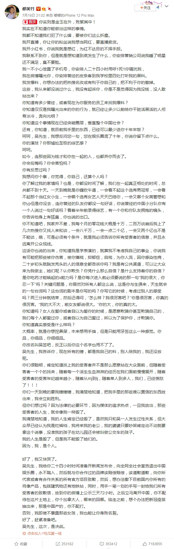 ![]() 都美竹和吴亦凡事件发生后,因为都美竹的一个爆料全文,还让吴亦凡收获了不少外号,比如“吴签”“吴痛针灸大师”等等,下面是当初都美竹爆料全文: ![]() |