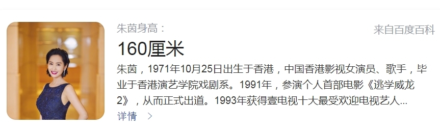 最近有一档综艺节目吸引了小编的眼球,那就是《请吃饭的姐姐》,节目嘉宾是蔡少芬、陈法蓉、洪欣和朱茵,都是红极一时的美人,她们私下也是非常要好的朋友,所以经常会“互怼”,比如说四个人刚见面,蔡少芬就吐槽朱茵最矮还敢穿平底鞋,气的朱茵跳起来回怼:我怎么穿都不如你们高。那么朱茵的身高到底是多少? 虽然说朱茵身高不如蔡少芬等人,但是她的长相却不输任何人,毕竟紫霞仙子可是很多人心中的女神,粉丝滤镜是个很神奇的东西,因此就算是朱茵个子不高、长得偏黑,也依然是娱乐圈有名的大美人,其实朱茵出道是非常早的,留下了很多经典角色,因此才会有那么多粉丝追捧。 朱茵是1971年出生的,第一部作品是《逃学威龙2》,因此进入了大众视野,后来又出演了《射雕英雄传》中的黄蓉一角,从此开始走红。而朱茵最有名的角色。就是《大话西游》中的紫霞仙子,让她在影史上留下了浓墨重彩的一笔,和黄贯中结婚后,朱茵就很少露面了,近些年才开始接一些综艺节目,比如说《偶像来了》,算是正式复出。 在朱茵的官方介绍中,她的身高是160cm,但网传朱茵的身高是153cm,甚至有传闻说是朱茵自爆的,但是并没有找到出处,所以这个说法没有依据,朱茵也没有在哪个节目中自爆过身高,不过朱茵的身高看起来确实不到160cm,因此她153cm的身高应该是真的,但是具体情况到底如何,恐怕只有当事人清楚了。