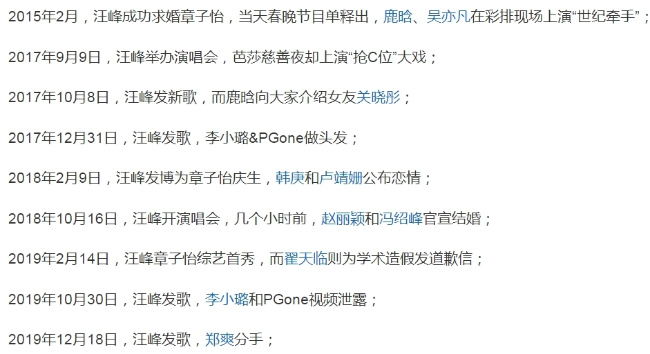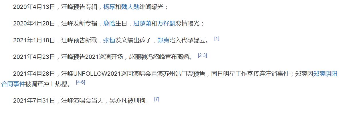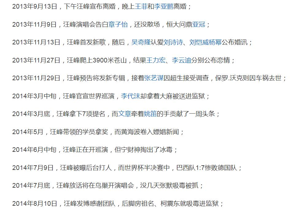 说起汪峰,很多人都会想起“半壁江山”的那个梗,当年汪峰团队发文称汪峰是华语乐坛的半壁江山,引起了网友们的调侃,后来汪峰又因为“上不了头条”梗而被网友热议,不过汪峰身上最大的梗是“汪峰定律”。 娱乐圈明星很多都是有自己的人设的,比如说吃货人设、学霸人设等,不过因为这些人设很容易崩塌,因此不少艺人翻车了,但也有少数几位,人设一直是非常稳固的,比如说萧敬腾的雨神人设,以及汪峰的演唱会定律,一直被称为娱乐圈的两大玄学,尤其是汪峰定律,这么多年来一直非常稳固,那么汪峰的演唱会是怎么回事? 汪峰定律历史事件盘点 不知道从什么时候起,坊间突然流传出一句话,“汪峰开演唱会必有大事发生”,这个梗一直广为流传,比如说2014年汪峰开巡演,宁财神吸毒被捕,2017年汪峰演唱会,芭莎慈善夜上演“抢C位”大戏,2018年汪峰开演唱会,赵丽颖和冯绍峰官宣结婚,2021年汪峰演唱会当天,吴亦凡被刑拘。此类事件不胜枚举,后来延伸成汪峰定律,就是汪峰发歌或者开演唱会等大动作的时候,娱乐圈总会有大事发生。 汪峰定律历史事件盘点 以往的汪峰定律大事盘点:2013年11,汪峰新歌首发,吴奇隆和刘诗诗官宣恋情、杨幂和刘恺威公布婚讯,2014年3月底,汪峰获音乐奖项多项提名,文章和姚笛出轨被曝光,2017年10月,汪峰发歌,鹿晗官宣女友关晓彤。同年12月,汪峰发歌,李小璐“做头发”事件曝光,2018年10月,汪峰开演唱会,赵丽颖和冯绍峰官宣结婚,2019年12月,汪峰发歌,郑爽宣布分手,2021年1月,汪峰预告新歌,郑爽被爆代孕,7月最后一天,汪峰开演唱会,吴亦凡被刑拘。 汪峰定律历史事件盘点