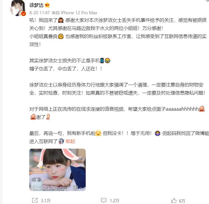 最近关于徐梦洁的消息都是可可爱爱的,丢手机之后关注评论的网友也很多,徐梦洁甚至也发了一条微博来回应此事,表示自己被狠狠的关心到了,But徐梦洁丢的不止是手机,还有帽子,还有伞,这也丢的太多了吧,粉丝表示很担心这个迷糊的小可爱。其实这不是粉丝第一个担心和心疼徐梦洁了,之前有一个徐梦洁在节目上说自己不想回去串鸡爪,这是哪一期,什么节目? 徐梦洁说不想回去串鸡爪是哪一期, 徐梦洁说不想回去串鸡爪是第九期的节目,节目上徐梦洁喊出了自己的心里话,“我想要继续追求自己喜欢的事,我不要再回去串鸡爪”。很多粉丝在这个时候开始了解到徐梦洁的家境,其实徐梦洁的家庭条件不是很好,家里是做烧烤生意的,年少懂事的徐梦洁也常常在家里帮忙,她的帮忙事项想来就是串鸡爪了。但是也看得出徐梦洁是很不喜欢串鸡爪的,才有了这样的喊声不要再回去串鸡爪。 其实这种伤感的时候,很多粉丝都开始要掉眼泪了,想不到爱豆的出生这么的困难,甚至有男网友回应说哥哥心疼,哥哥就算是卖银也要给你买卡护你出道,一时间评论画风突变,更多粉丝回应说大可不必。不过这件事造成的热度还不小,徐梦洁也这样的被推上了热度。 什么节目? 徐梦洁说不想回去串鸡爪的节目是《创造营101》,这个国内很大的女团竞演节目,近年来出了很多优秀的艺人,像是徐梦洁,最终徐梦洁也并没有辜负大家的期望,没有回家串鸡爪,她获得了第十一名的成绩,加入了“火箭少女101”。直到现在徐梦洁已经有了自己的一片星路,十分坦荡了。