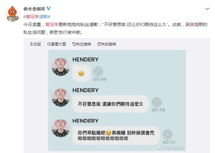 最近接连有网友曝光了黄旭熙的私生活问题,对此他的经纪公司SM很快做出回应,称将中断原定于8月25日黄旭熙&黄冠亨单曲《Jalapeño》音源和MV等所有内容的公开。黄旭熙这真是坑队友的操作,因为自己,导致黄冠亨一起受累。据悉,黄冠亨,1999年9月28日出生,今年22岁,目前是威神V(WayV)成员,因为黄旭熙的事,黄冠亨也向粉丝表达了歉意,称:“不好意思啦 还让你们期待这么久”。