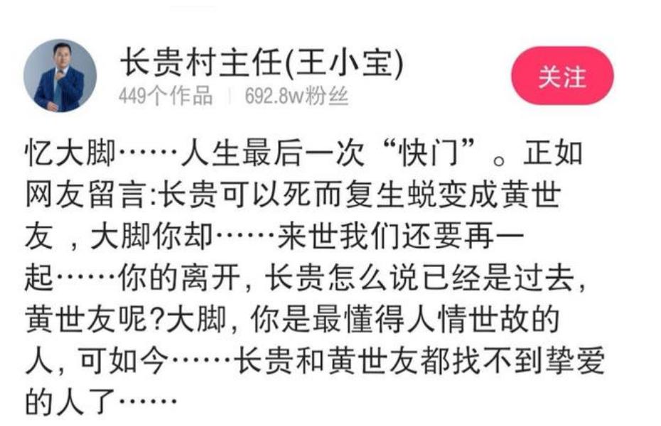 最近让人比较难过的一件事,就是谢大脚的扮演者于月仙的突然离世,2021你那8月9日,年仅50岁的于月仙在内蒙古阿拉善遭遇车祸去世,因为她走的太过突然,让很多网友都感到不可置信,这位曾经低调无比的演员,前几天一直挂在热搜上,也因此让人们对她的生平有了一些了解。 于月仙因为出演《乡村爱情》中的谢大脚而成名,作为“乡爱”宇宙的灵魂人物,大脚婶是很多人看《乡村爱情》的初心,如今大脚婶突然离世,很多人都觉得《乡村爱情》系列也到了结束的时刻,在《乡村爱情》中饰演长贵的王小宝也直言,没有了谢大脚,他也要退出《乡村爱情》了。 王小宝是赵本山的弟子之一,曾经在《刘老根》系列和《乡村爱情》系列中都有出演,算是赵本山弟子中比较有名气的一位,因为和于月仙在《乡村爱情》中饰演情侣,因此被人误以为是一对,但其实他们只是朋友和搭档关系,两人有过多次合作,所以关系一直不错,于月仙去世后,王小宝发布的情真意切的小作文感动了很多网友。那么王小宝的妻子是谁? 很多人都以为王小宝的第一任妻子是孙立荣,就是在《乡村爱情》中扮演“刘能媳妇”的那位演员,其实并非如此,王小宝和孙立荣只是搭档关系,王小宝的第一任也是现任妻子是吴琼,吴琼的年级据说比王小宝小很多,所以很多人都以为王小宝是二婚,前段时间王小宝还为庆祝妻子吴琼生日而举行了party,因此还吸引了很多网友的目光。